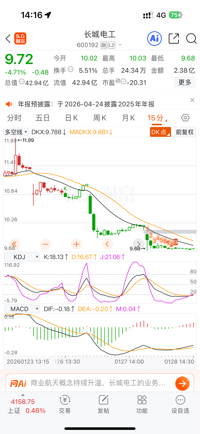 $长城电工(SH600192)$ 15分钟趋势向下,继续看空
