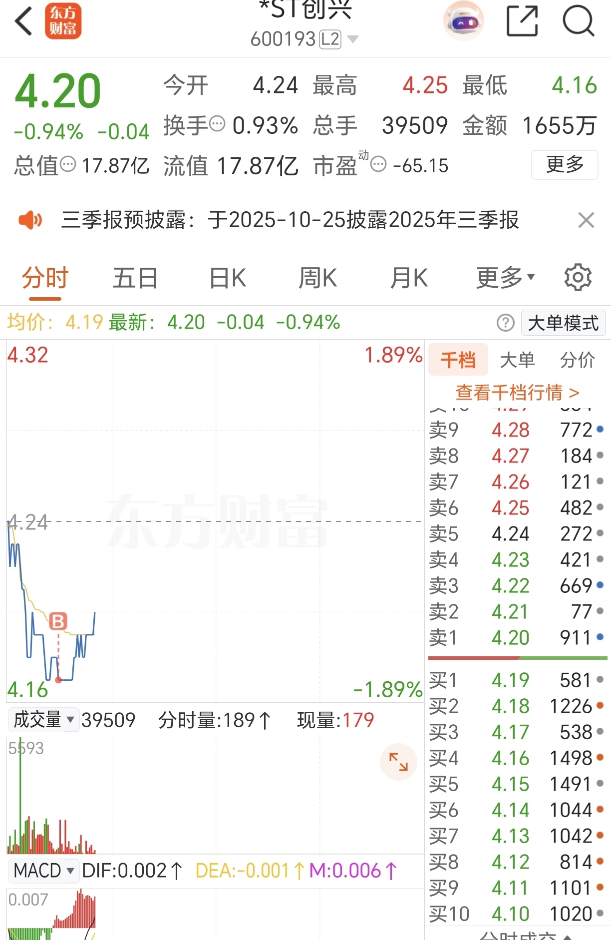 $*ST创兴(SH600193)$ 大盘红它绿。。渣渣,等下能t几分钱?