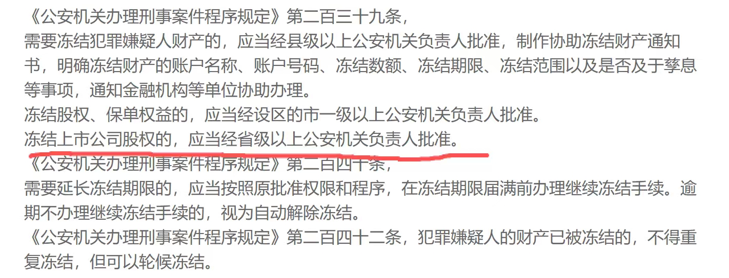 如果冻结前未处理,则需要续冻,续冻最终由省级公安机关负责人拍板,且需要报给中国证券登记结算公司。这个流程复杂耗时,且需浙江省公安厅一把手批准,一般都是能不延期就不延期。
