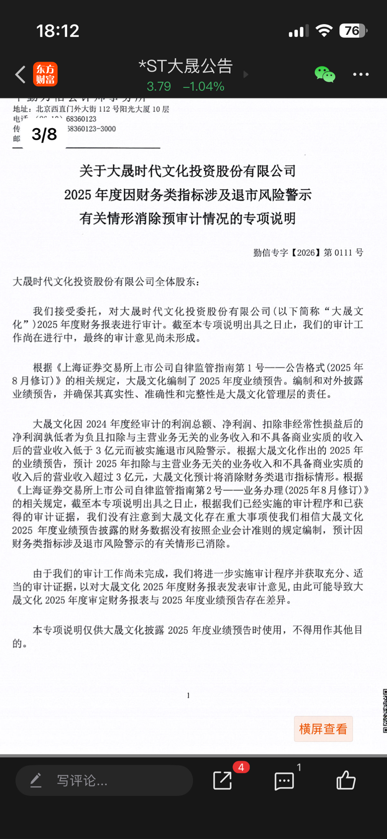 $*ST创兴(SH600193)$ 前三季度只有1800万,第四季度干出3亿多的营收。骗gui呢。。。正常的退市公司,会计师对业绩预告的内容是这样的。所以这货年报一出,抬走