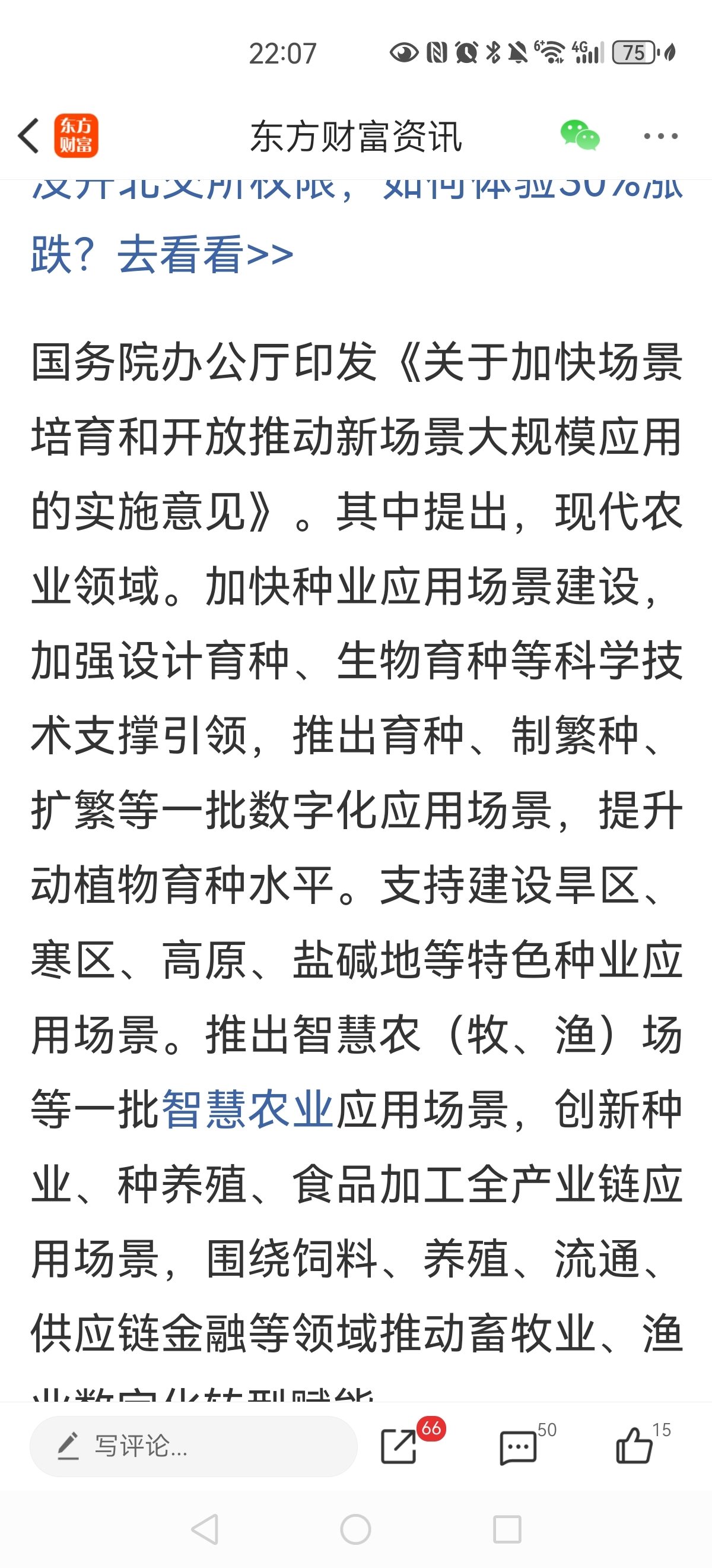 $中牧股份(SH600195)$ 国务院办公厅印发《关于加快场景培育和开放推动新场景大规模应用的实施意见》。其中提出,现代农业领域。加快种业应用场景建设,加强设计育种、生物育种等科学技术支撑引领,推出育种、制繁种、扩繁等一批数字化应用场景,提升动植物育种水平。支持建设旱区、寒区、高原、盐碱地等特色种业应用场景。