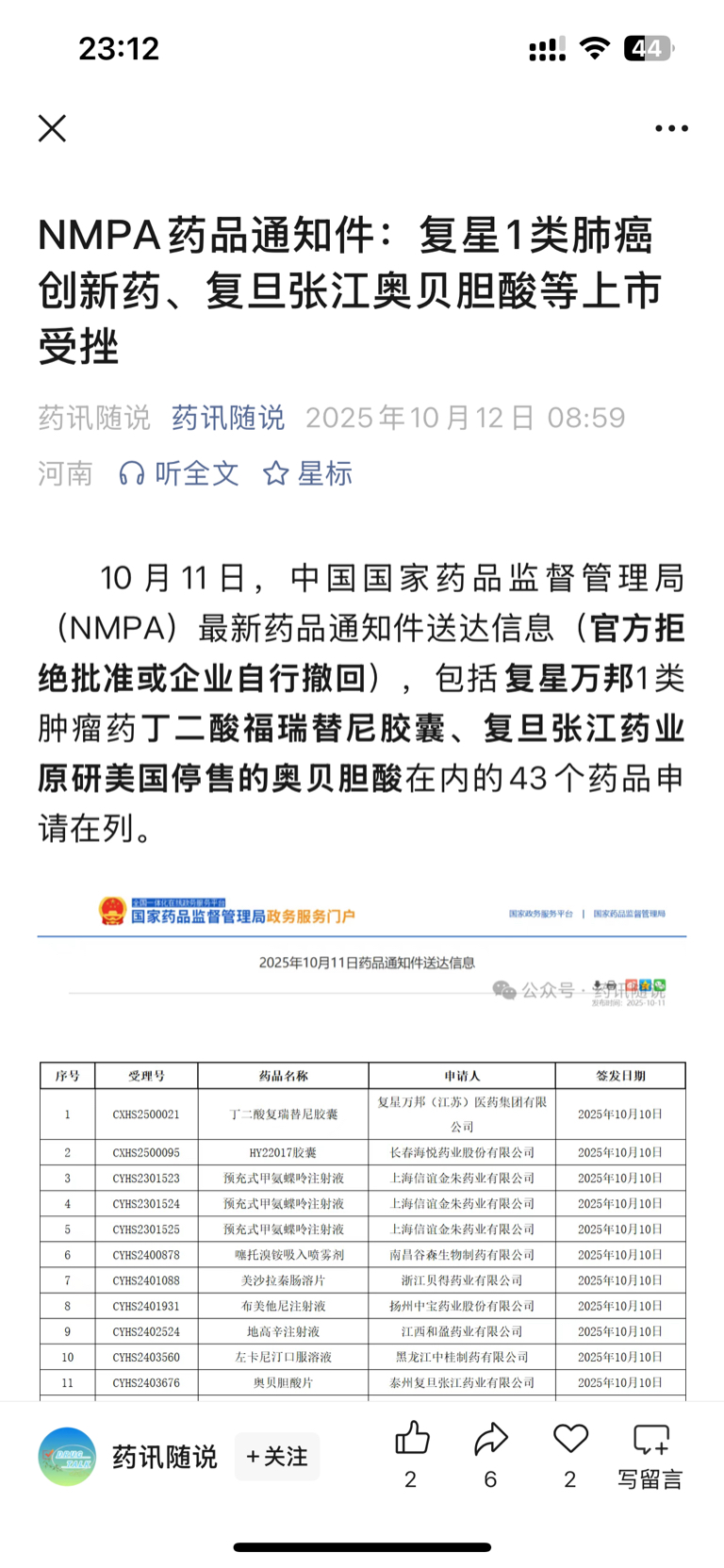 $复星医药(SH600196)$ 双重打击啊,新药申请上市被否了,这估计真要跌停了