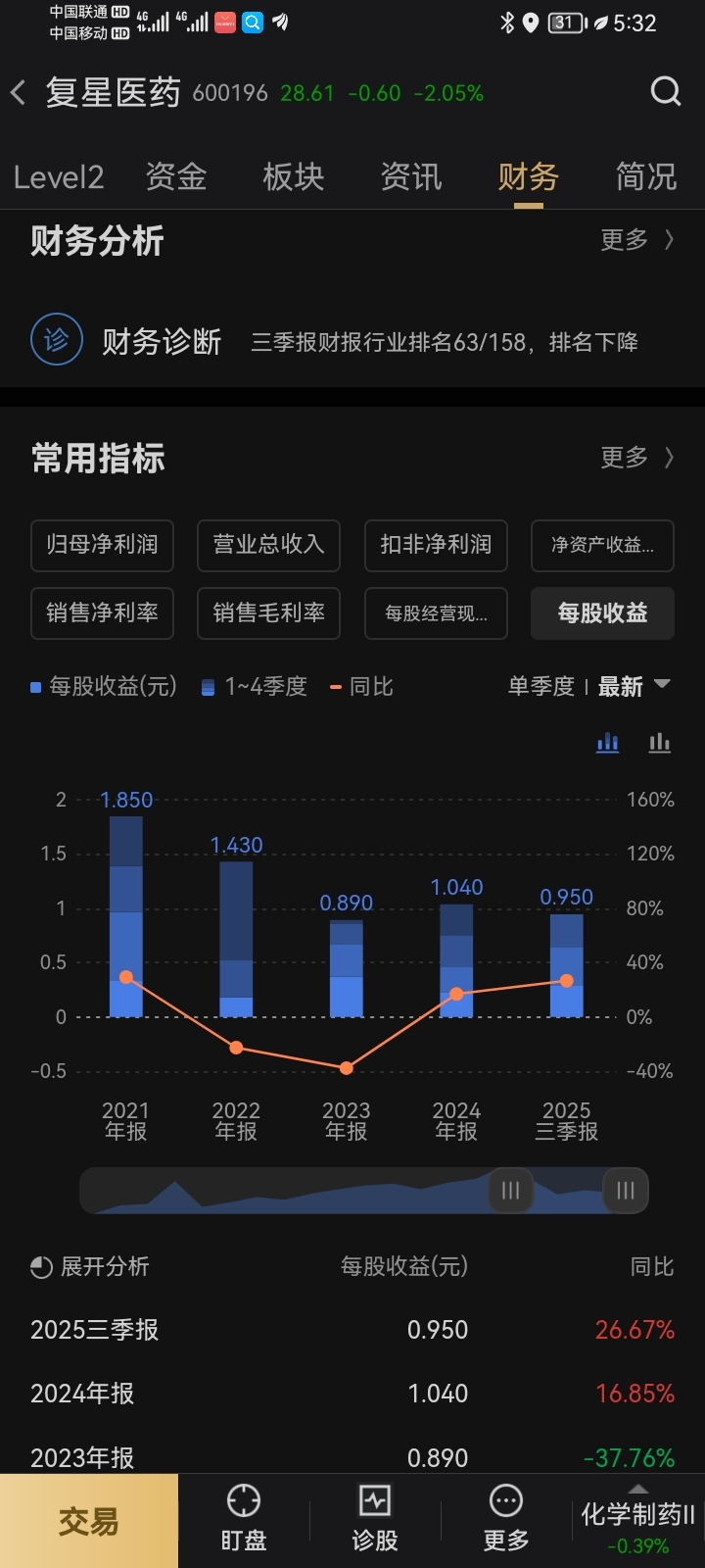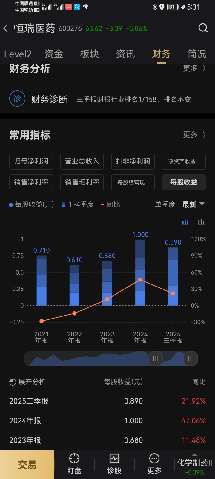 每股收益,恒瑞医药跟复星医药比较一下,再比较一下股价,你心里就不慌了,且复星医药已经逐步走上发展阶段了。