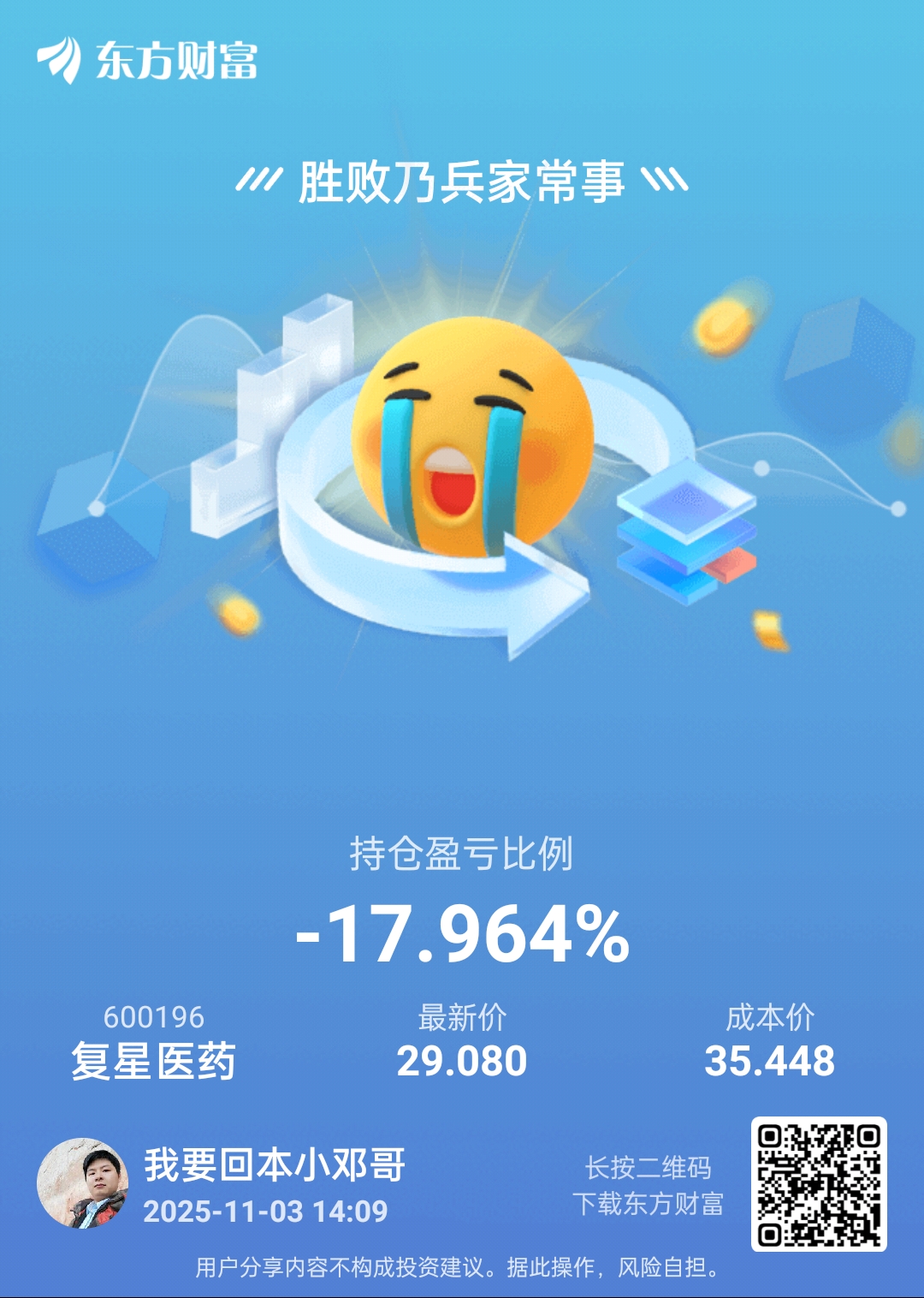 $复星医药(SH600196)$ 本来回本赚钱了,我却最低点割肉了,现在亏这么多还没回本吗