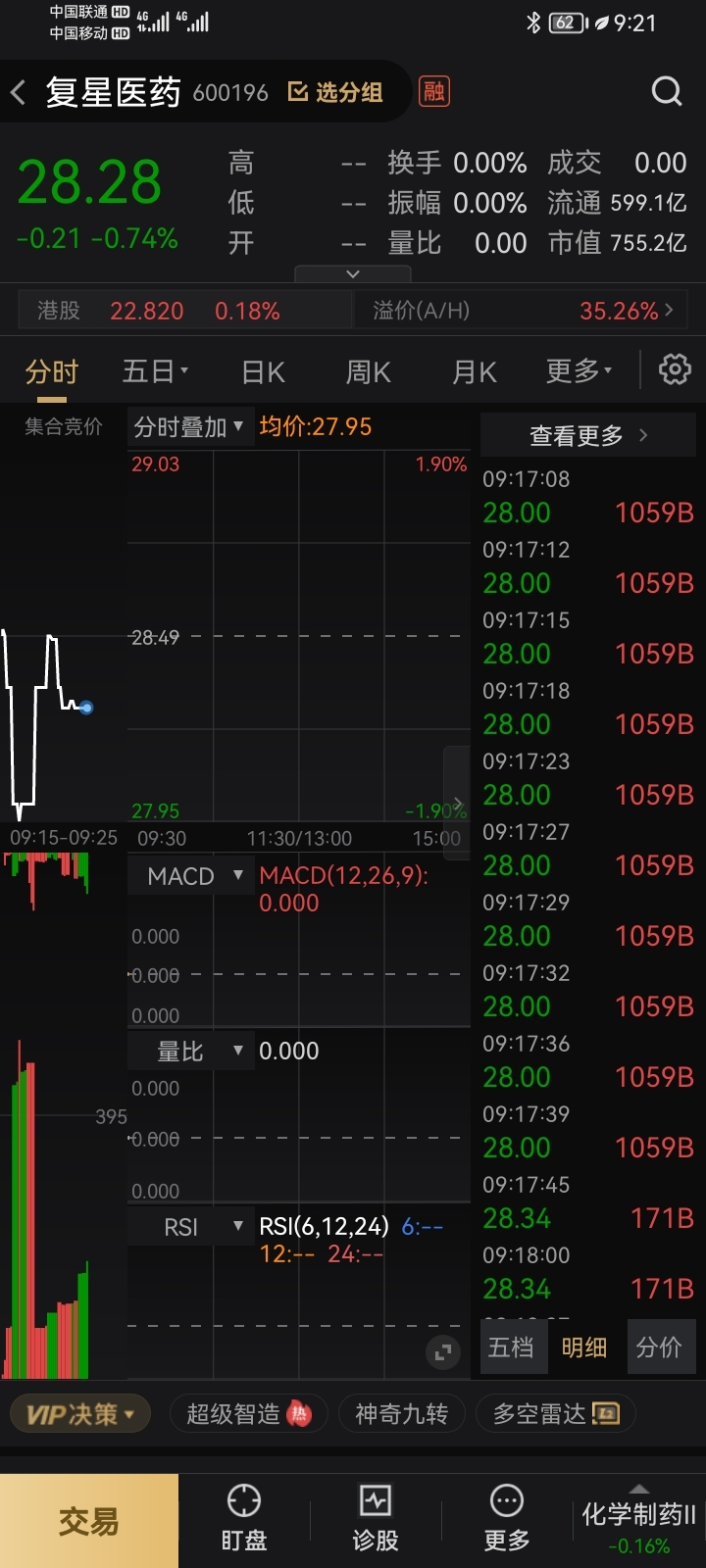 集合竞价最低27.96,今天无论涨跌都会打穿28元的,想买入的,等跌穿28元再考