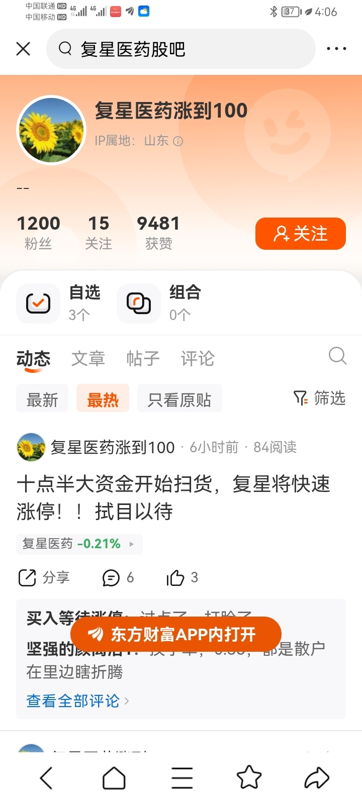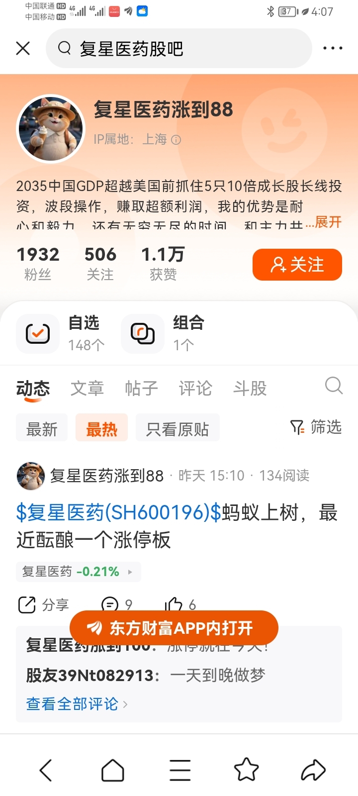 复星医药最受欢迎的两位大博主,88,100!!粉丝过千,如果做网红直播带货,估计不错