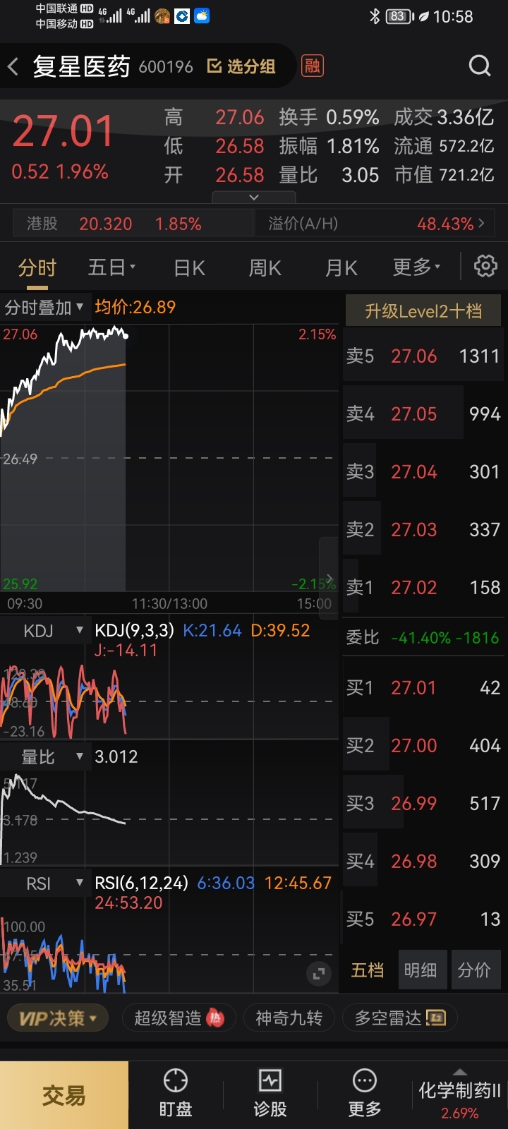上下摆满单,复星医药里的庄家是个长期盘居在里面量化交易的庄家,涨跌也就是2个点!
