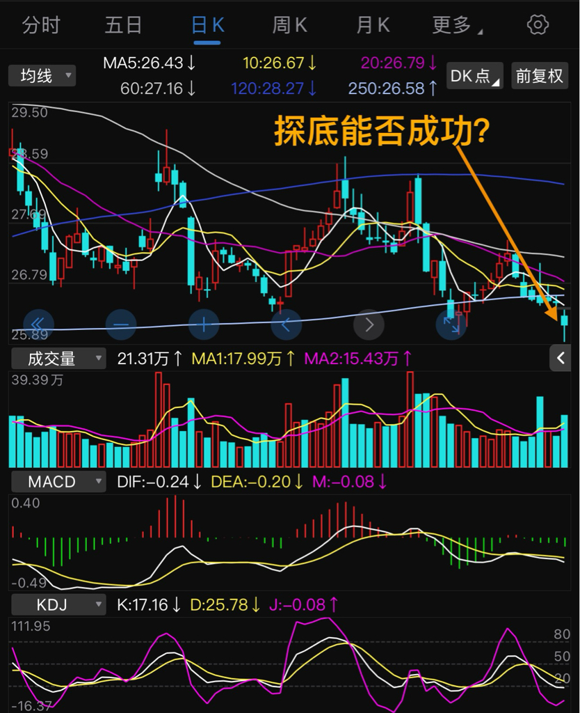几年前从高点下来,成本在40元以上的人比比皆是,而现在26元的股价,输的最多是时间。从短期来看,日K线级别的年线支撑已有效跌破,主力故意砸坑的迹象明显。特别是今日这跟探底K线形态,有极大的见底可能性,但谁又能百分百保证呢!不过从我多年的经验来看,我有相当的大的把握和信心。我推测只要明日大盘没有风险,出大阳线的概率极高。