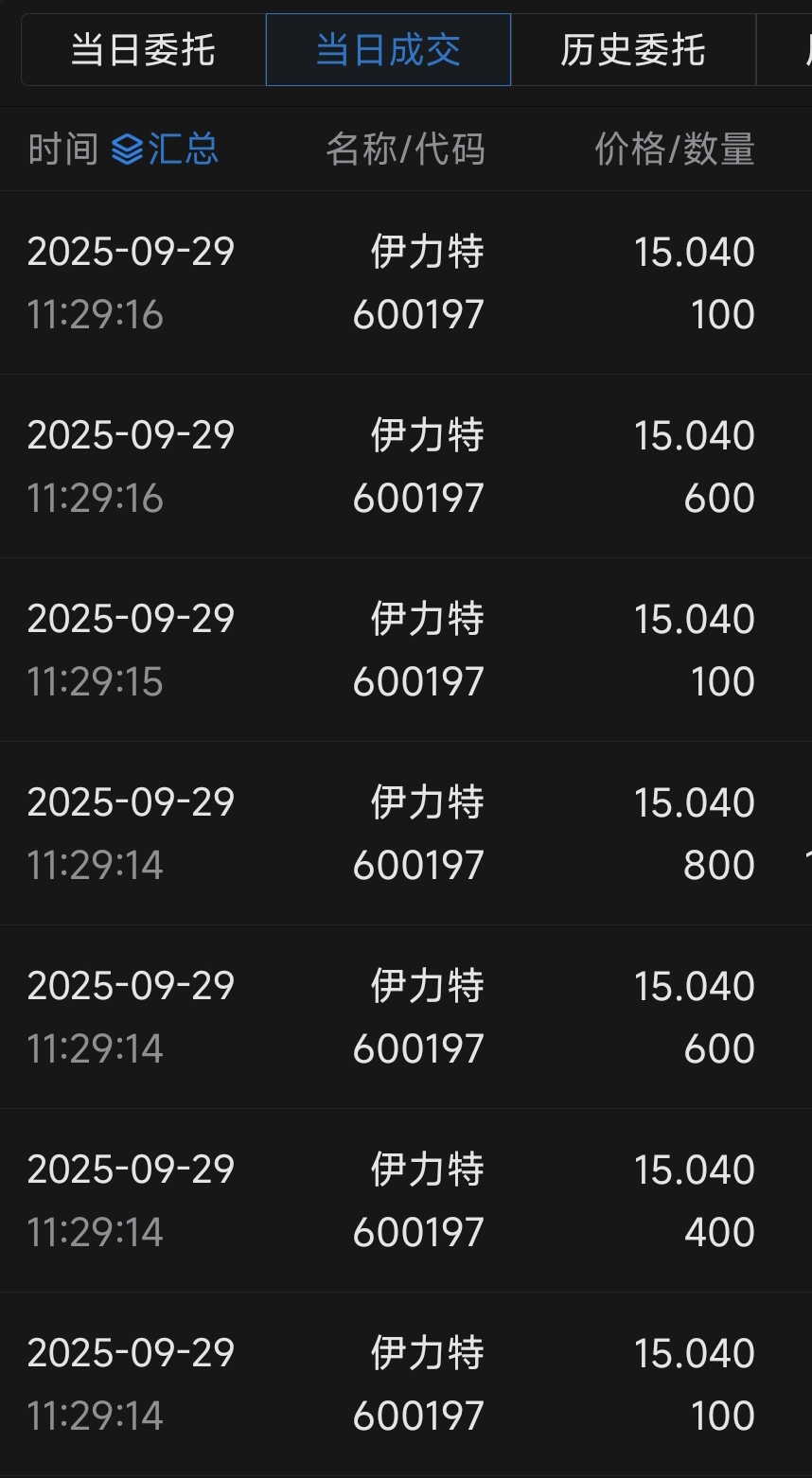 今天是散户清仓的时间,27手,成交量这么多笔。散户投降了。