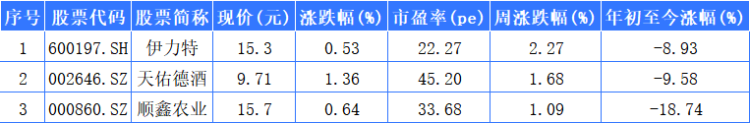 同花顺iFinD数据显示,3只白酒A股本周上涨,伊力特、天佑德酒、顺鑫农业分别以2.27%、1.68%、1.09%,列白酒A股周涨幅前三。
