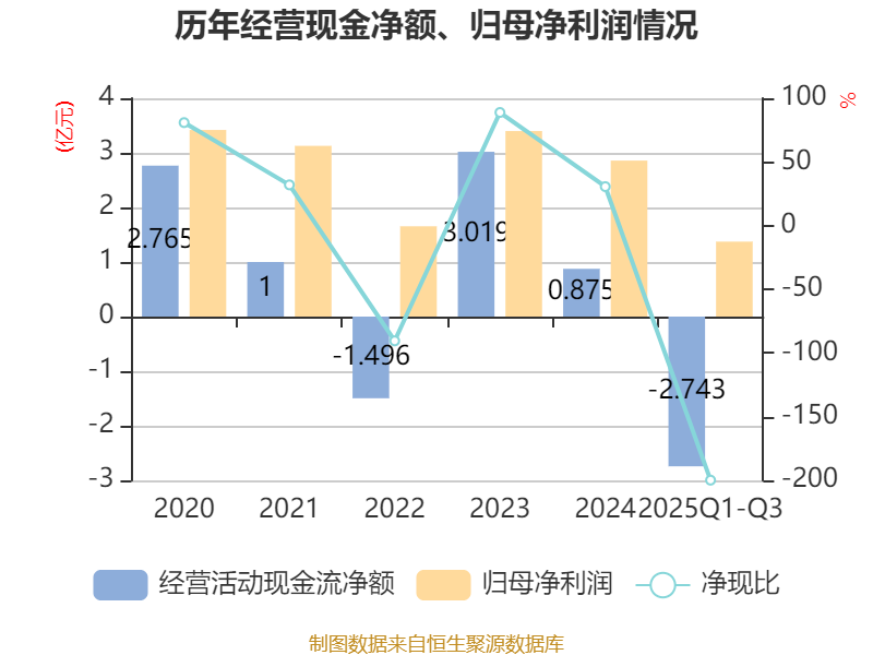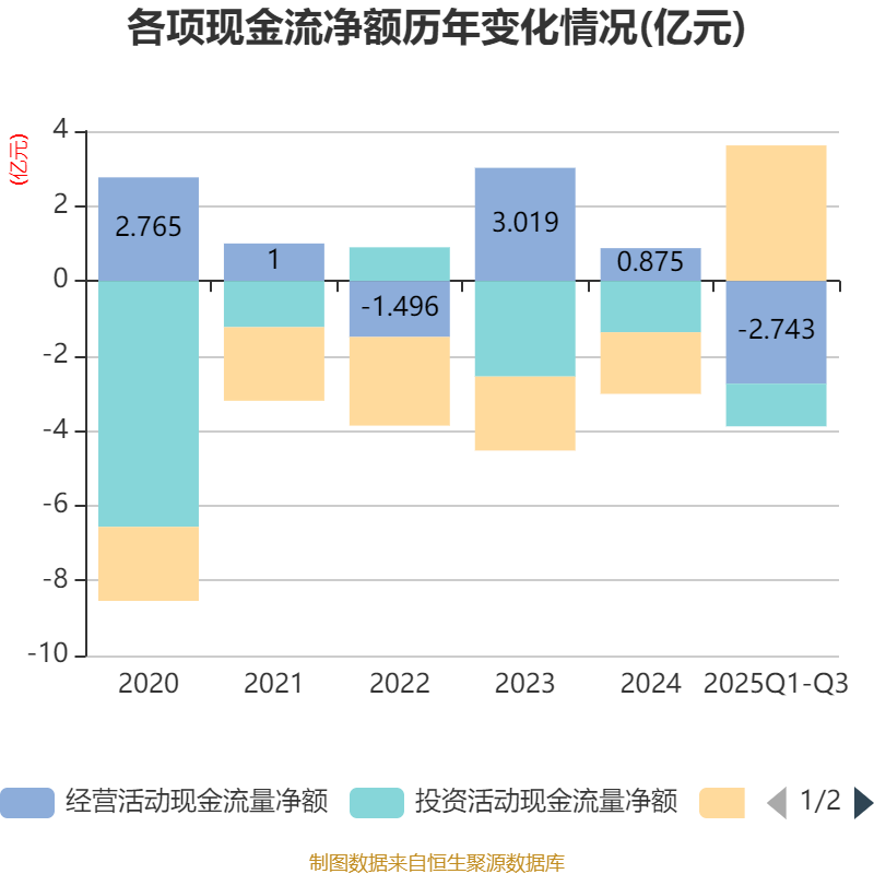 2025年前三季度,公司经营活动现金流净额为-2.74亿元,同比减少2.98亿元;筹资活动现金流净额3.62亿元,同比增加4.46亿元;投资活动现金流净额-1.14亿元,上年同期为-1.05亿元。