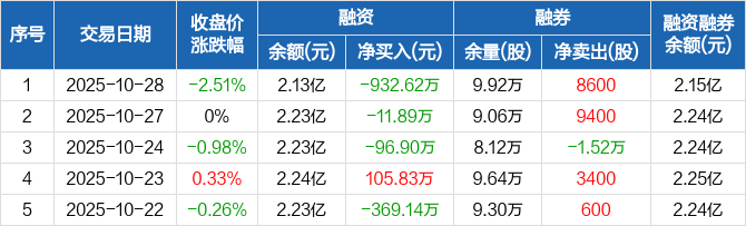 融资方面,当日融资买入743.07万元,融资偿还1675.7万元,融资净偿还932.62万元,连续3日净偿还累计1041.41万元。融券方面,融券卖出9700股,融券偿还1100股,融券余量9.92万股,融券余额146.32万元。融资融券余额合计2.15亿元。