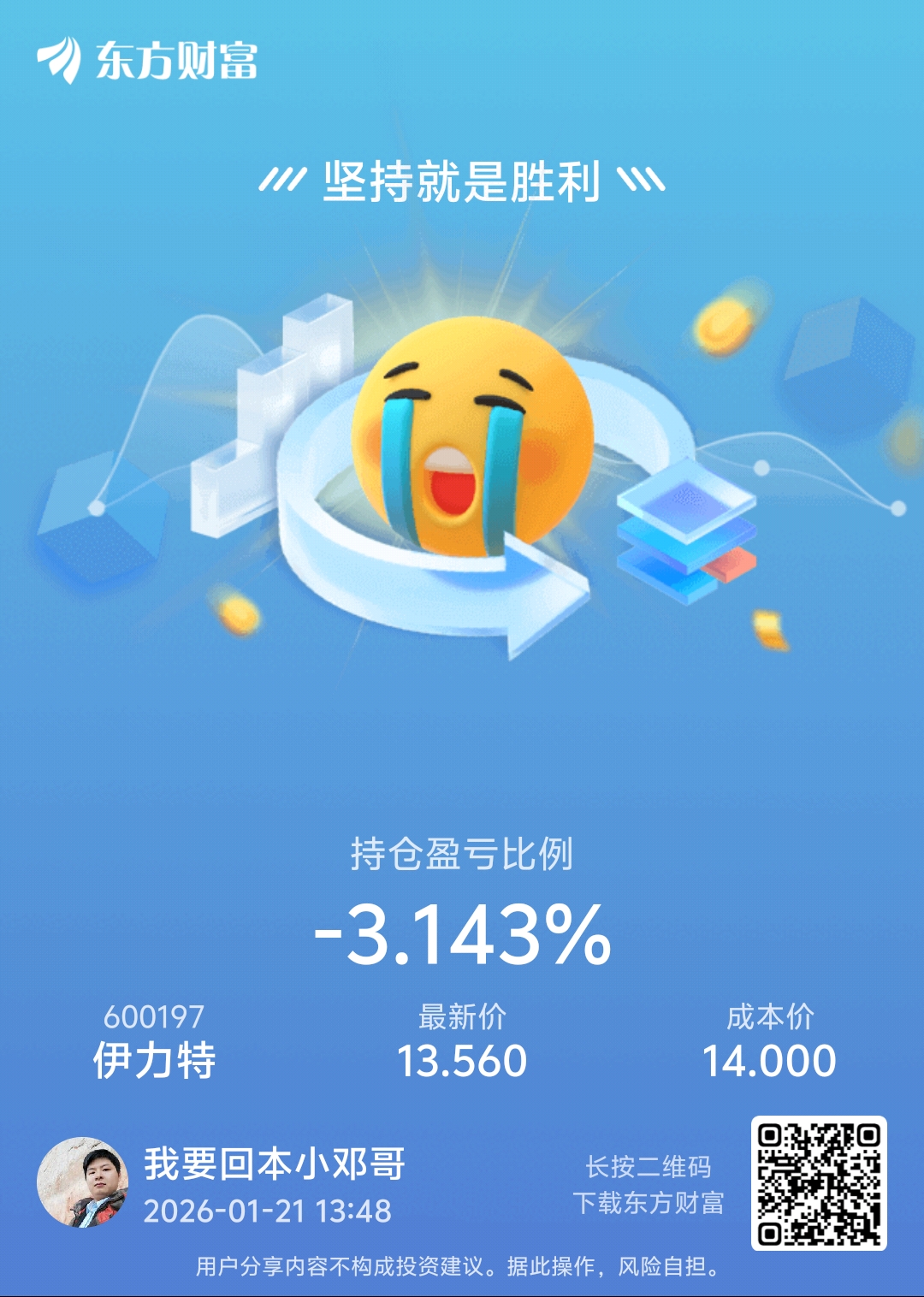 温馨提示: 1.根据《证券法》规定,禁止编造、传播虚假信息或者误导性信息,扰乱证券市场;2.用户在本社区发表的所有资料、言论等仅代表个人观点,与本网站立场无关,不对您构成任何投资建议。用户应基于自己的独立判断,自行决定证券投资并承担相应风险。《东方财富社区管理规定》
