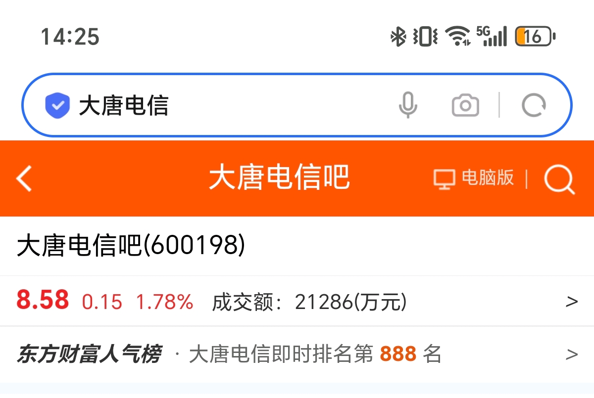 $大唐电信(SH600198)$ 8.58元股价,人气排名888名,交易额 2.128亿,全好数字,牛牛牛起来了