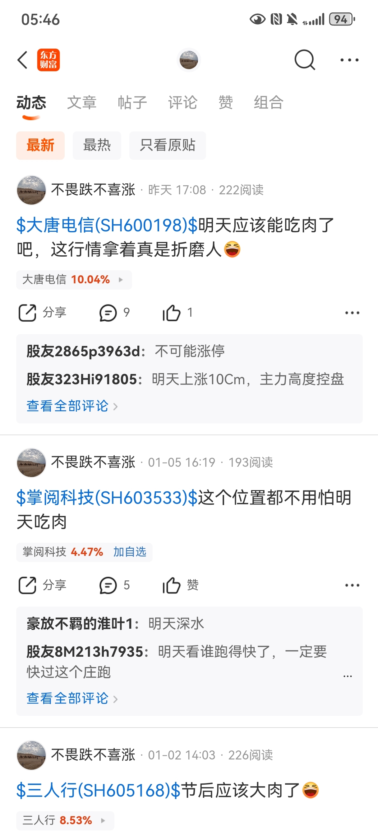 $大唐电信(SH600198)$ $三人行(SH605168)$ 哈哈,可惜都是小仓位