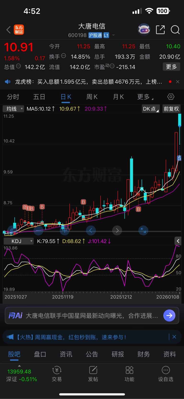 $大唐电信(SH600198)$ 一般情况下,只要我卖了,明天就开始涨了,祝各位好运吧,涨停也不眼馋了,知足吧