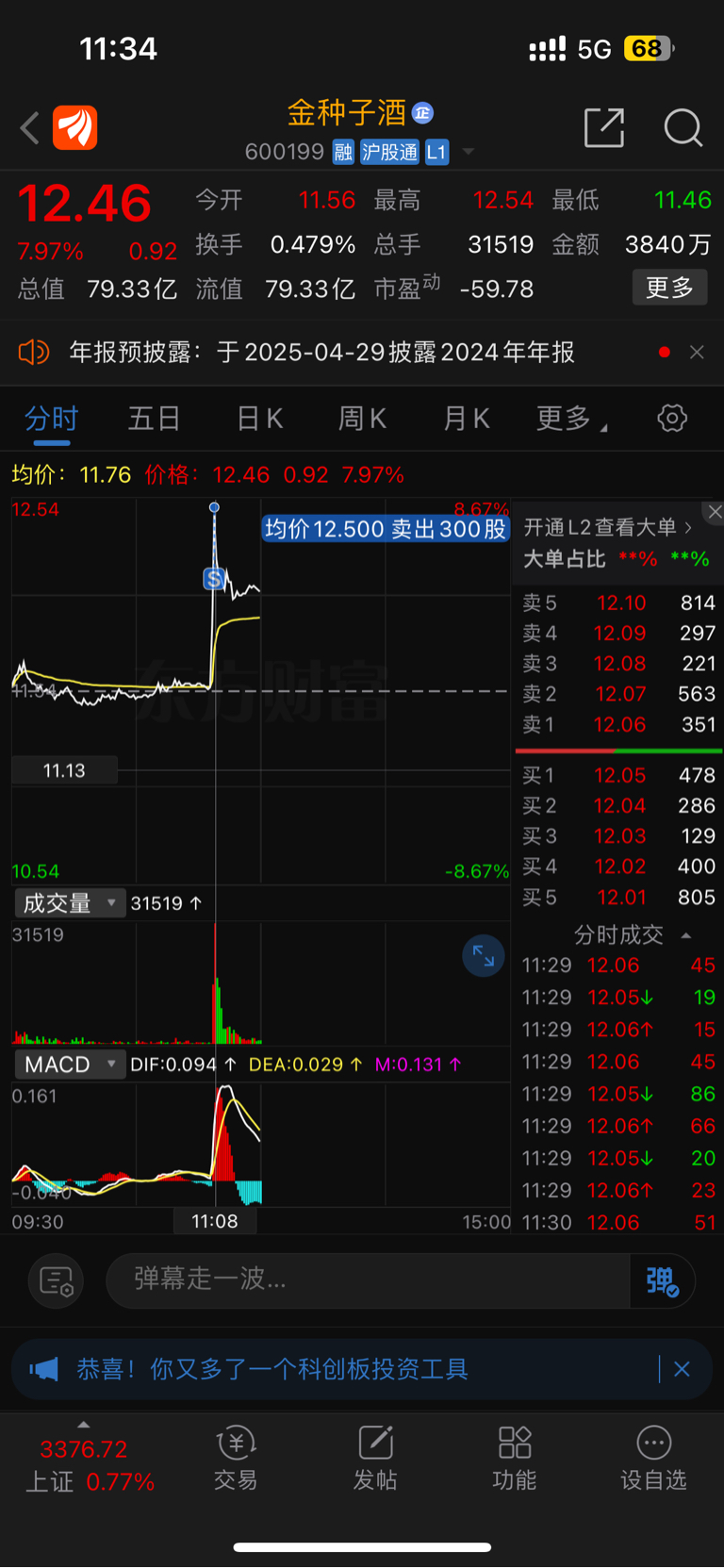 $金种子酒(SH600199)$ 走了,赚了六十三块钱