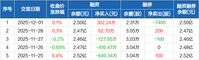 融资方面,当日融资买入663.06万元,融资偿还360.82万元,融资净买入302.24万元。融券方面,融券卖出0股,融券偿还7400股,融券余量2.31万股,融券余额23.26万元。融资融券余额合计2.5亿元。