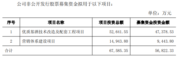 公司非公开发行股票募集资金拟用于优质基酒技术改造及配套工程、营销体系建设两大项目。