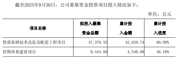 募投项目进展方面,公告显示,2023年4月26日,公司召开了第七届董事会第四次会议和第七届监事会第四次会议,审议通过《关于募集资金投资项目延期的议案》,同意将“优质基酒技术改造及配套工程项目”和“营销体系建设项目”的预计建设完成日期延长至2025年12月31日。