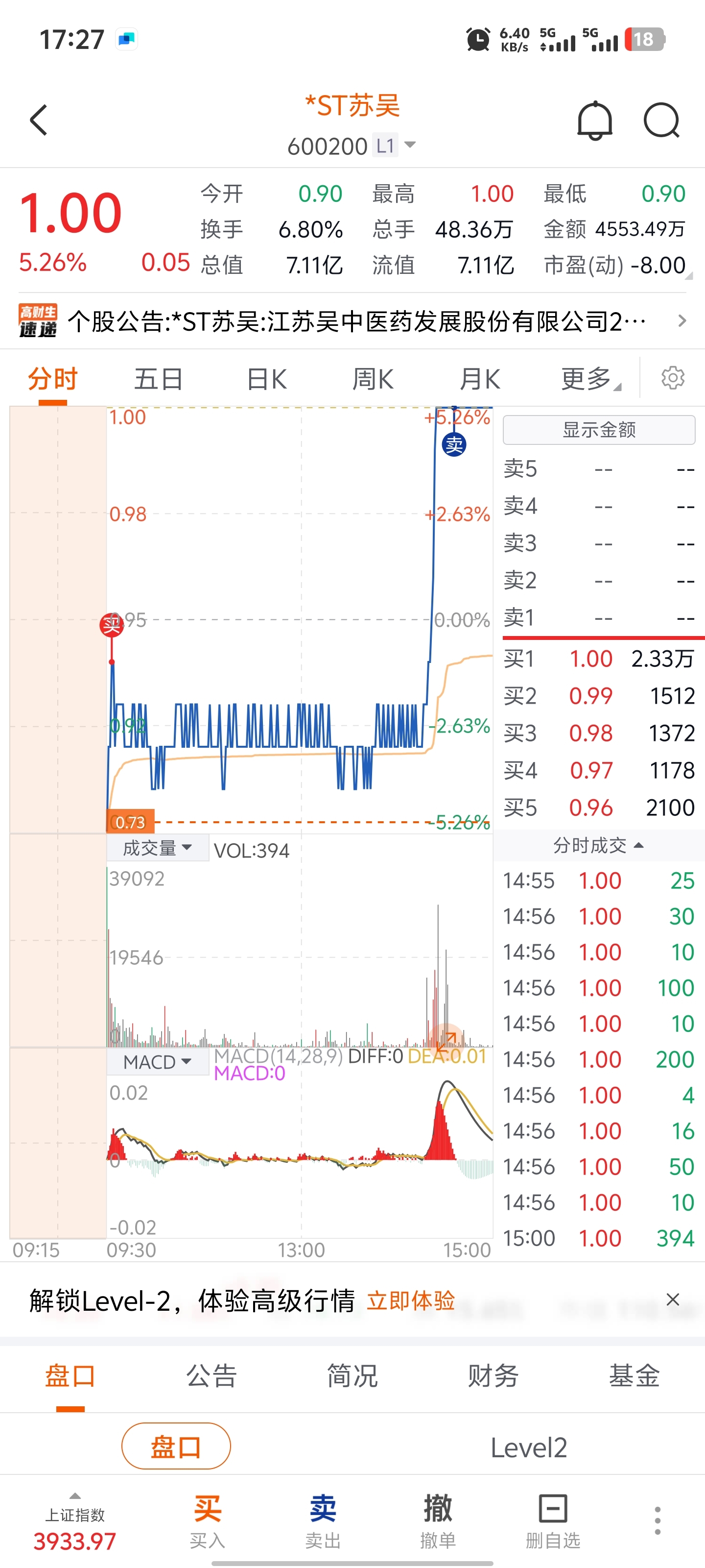 $*ST苏吴(SH600200)$ 今天进了点货,感觉还会下来,然后做个t,留了3成仓