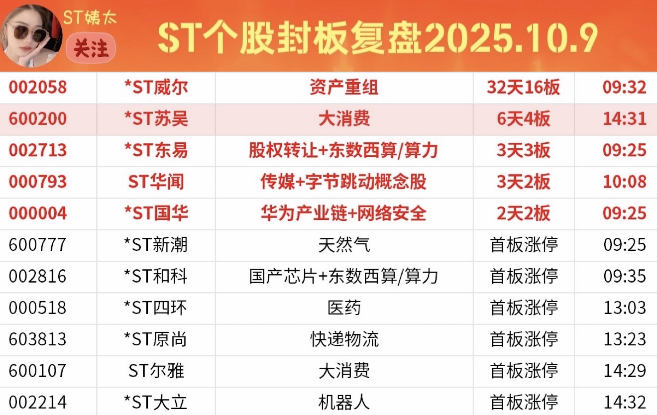 ST个股封板追踪:榜二*ST苏吴