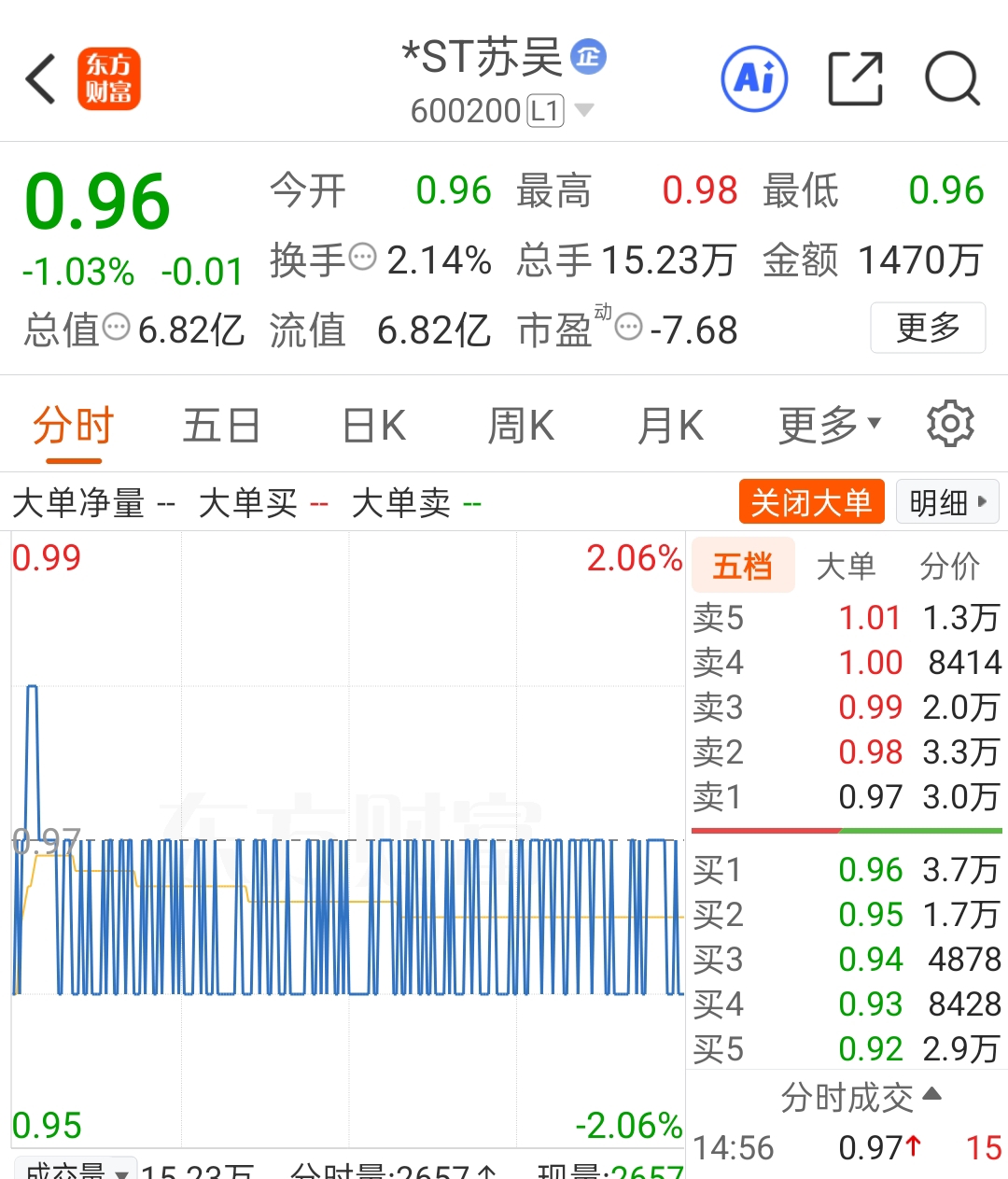 $*ST苏吴(SH600200)$ 我就好奇了,这上面到底是哪些能低于今日最低值买入的?挂了0.95都买不进,0.92到底是怎么买进去了?单量还不小呢!