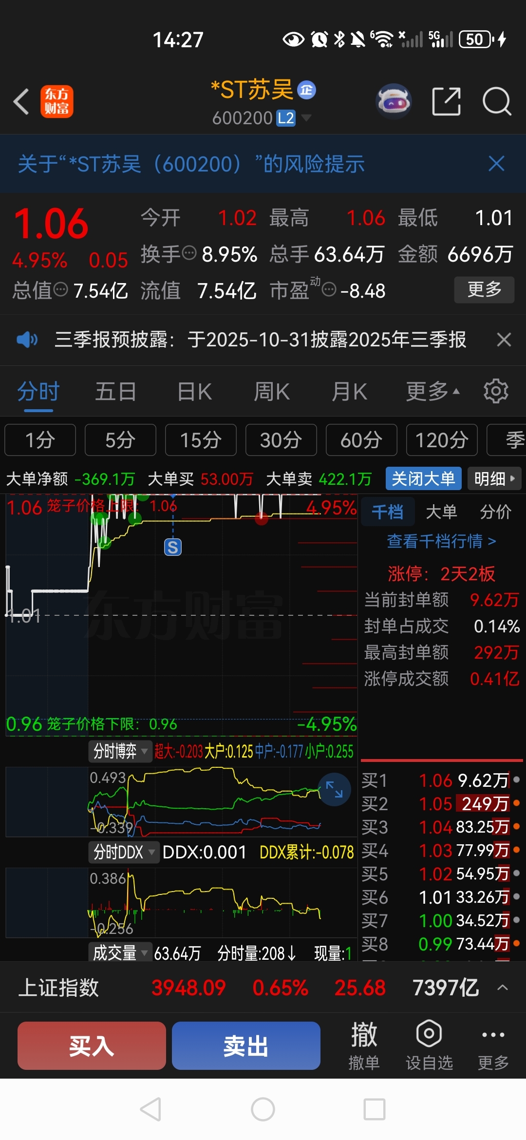 $*ST苏吴(SH600200)$ 走了盈利九个点,随时可能会退掉,先走为上