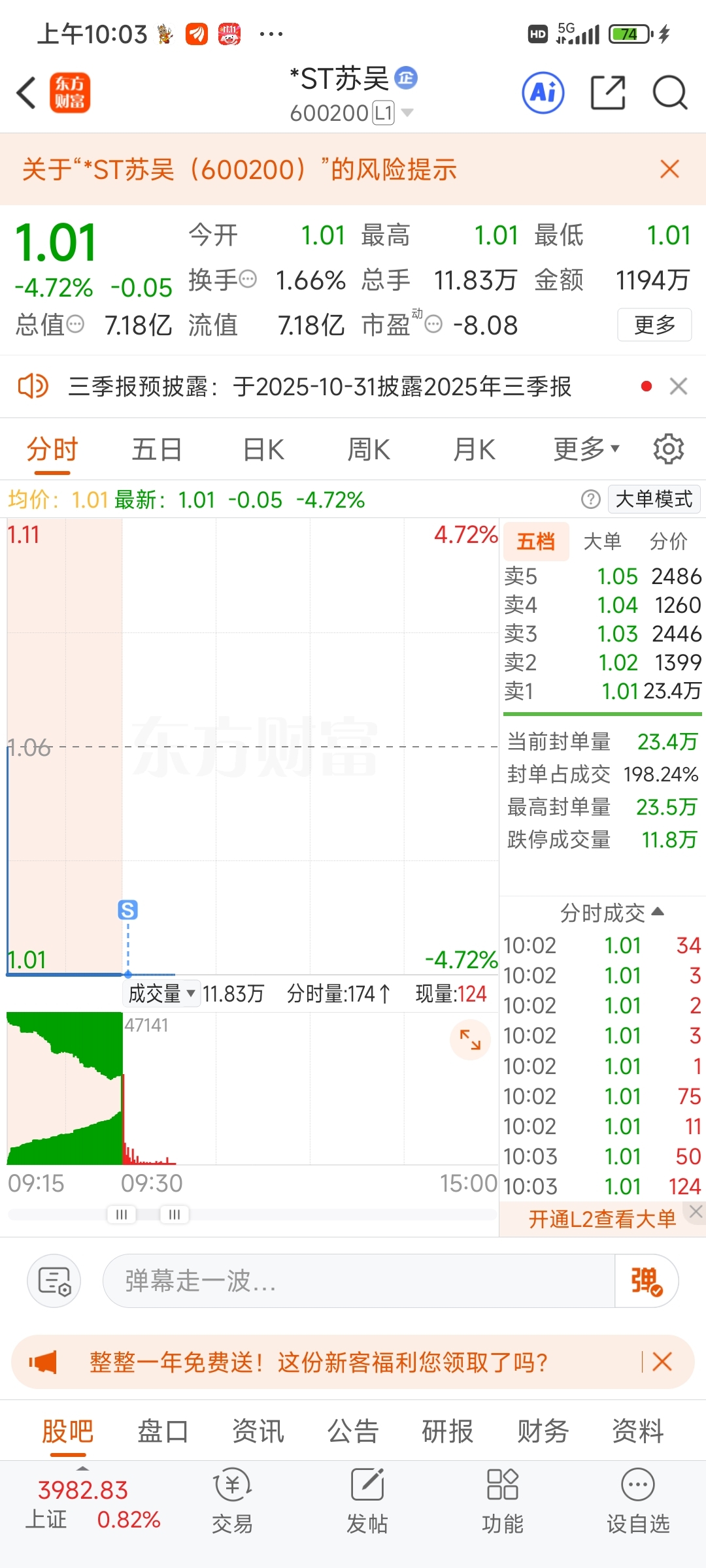 $*ST苏吴(SH600200)$ 有点怪,这莫大封单量,我说卖就卖出去了,