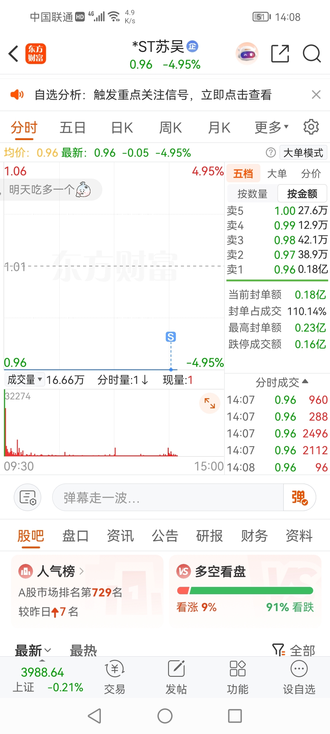 $*ST苏吴(SH600200)$ 早盘9.21分挂卖出的100股,刚成交