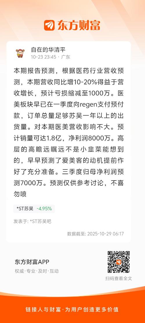 本期报告预测,根据医药行业营收预测,本期营收同比增10-20%得益于营收增长,预计亏损缩减至1000万。医美板块早已在一季度向regen支付预付款,订单总量足够苏吴一年以上的出货量。对本期医美营收影响不大。预计销量可达1.8亿,净利润8000万。高层的高瞻远瞩远不是小韭菜能想到的,早早预测了爱美客的动机提前作好了充分准备。三季度归母净利润预测7000万。预测仅供参考讨论,不喜勿喷