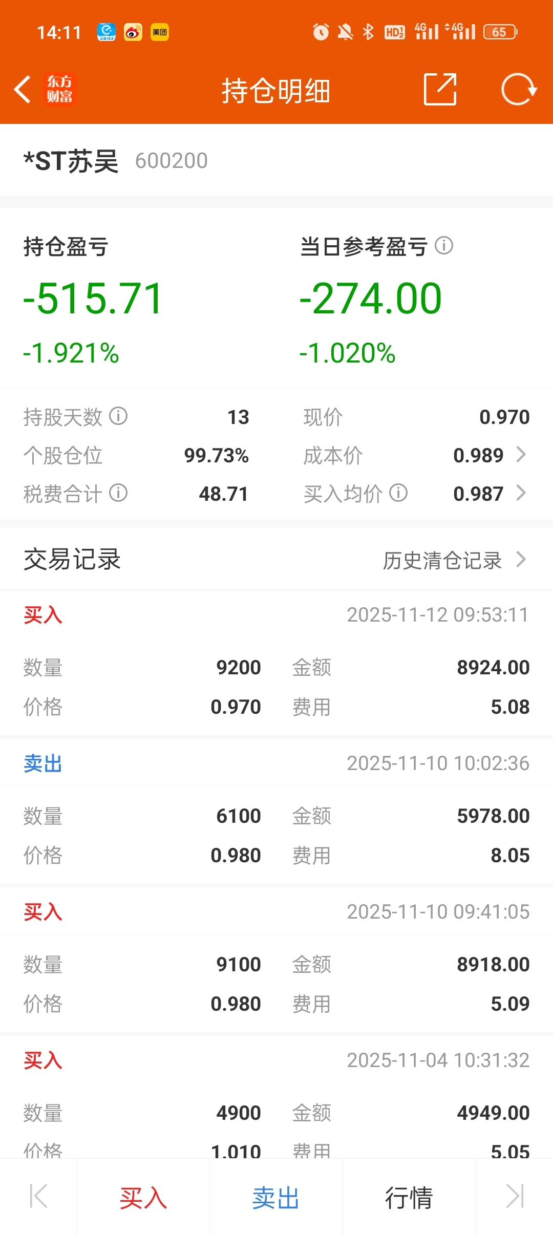 $*ST苏吴(SH600200)$ 坚定持有,退市也买。持仓的第13天。