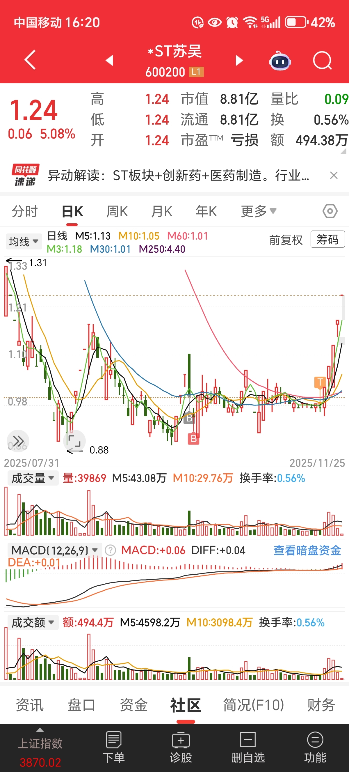 $*ST苏吴(SH600200)$ 坚持一个月了
