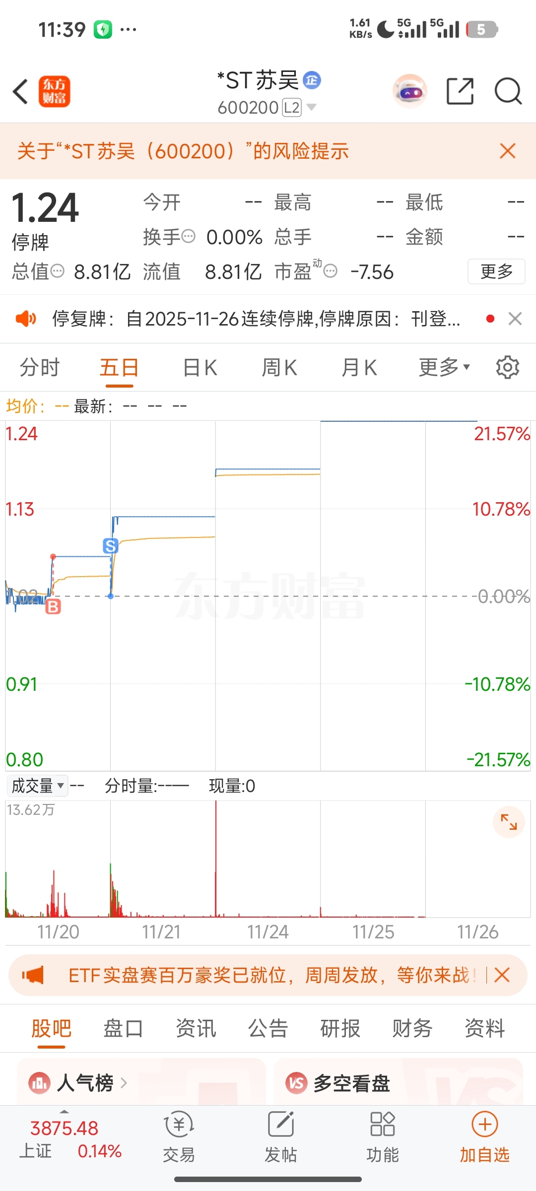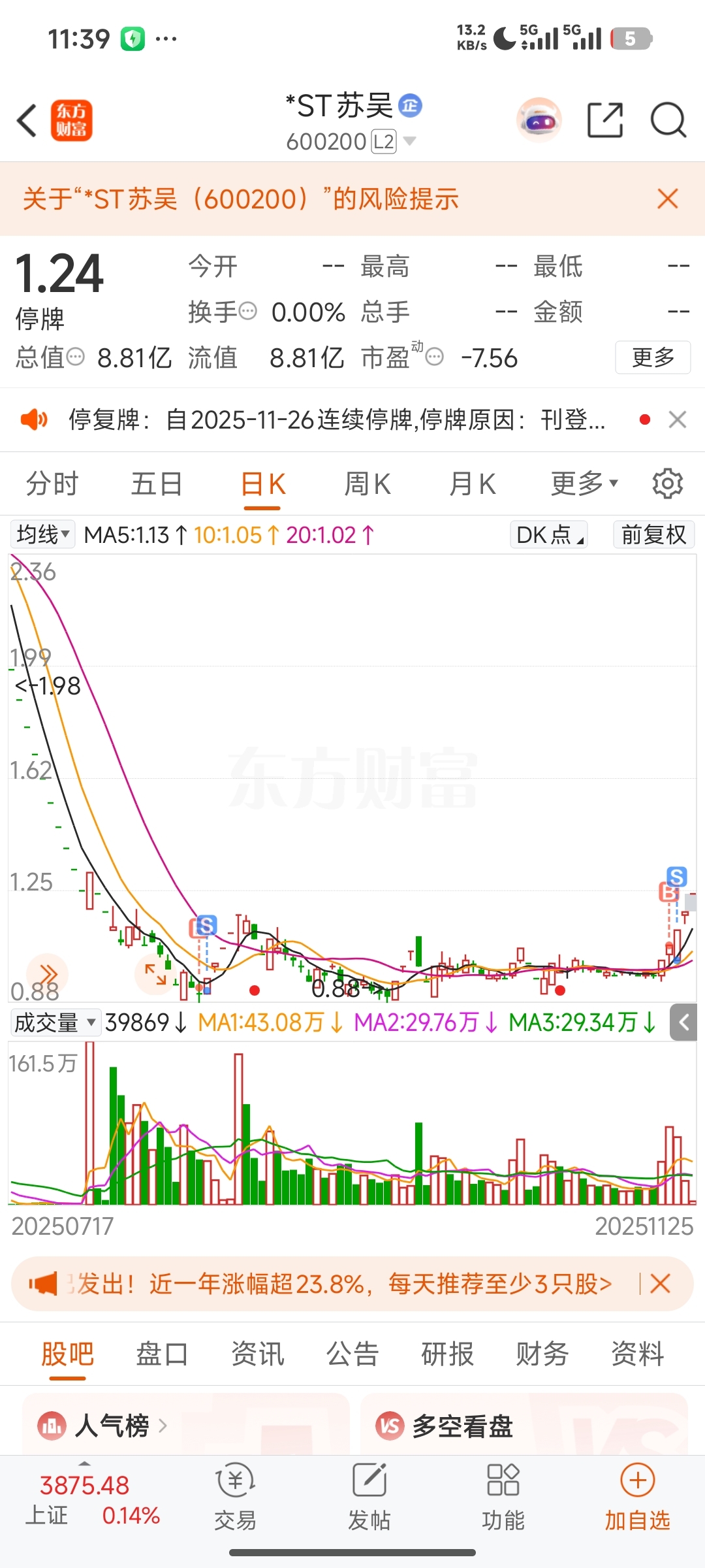 $*ST苏吴(SH600200)$ 退市前为啥拉几个涨停?因为情绪,最近的$ST中迪(SZ000609)$ 给很多人暴富的机会,而场外不敢去高位的就来这里,别人不知道是不是,我肯定是的。塞翁失马,焉知非福。亏5个点随礼退市的兄弟们。
