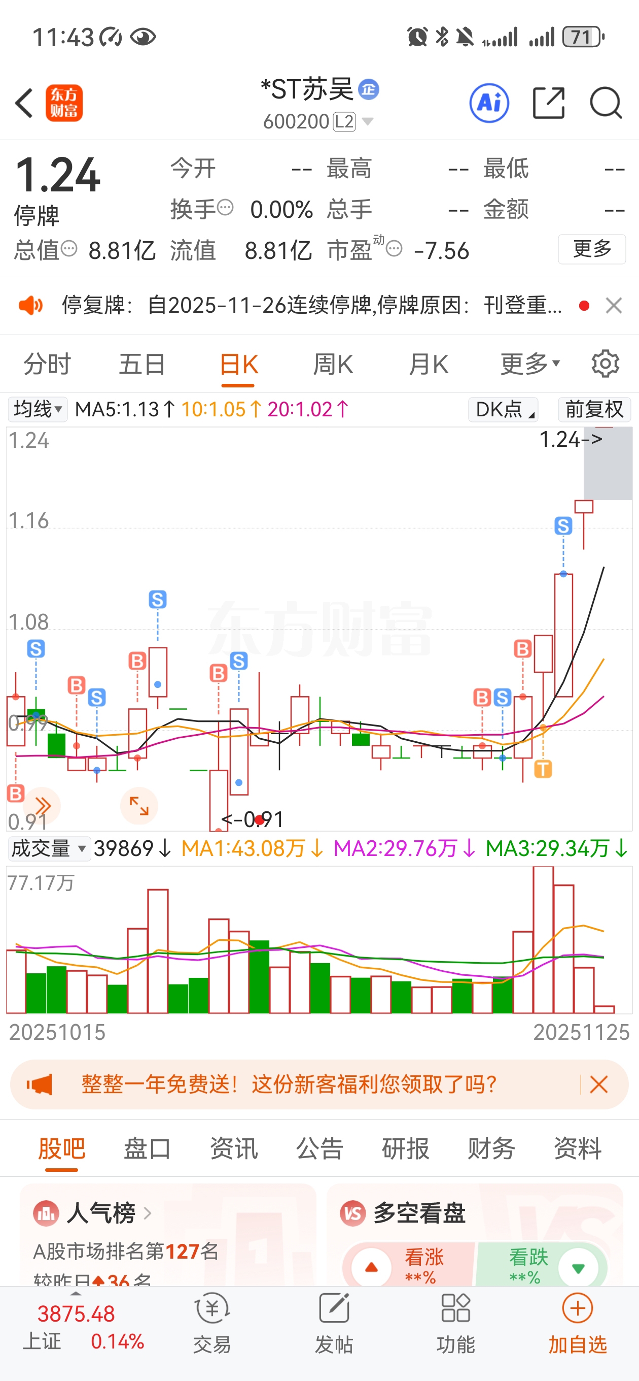 $*ST苏吴(SH600200)$ 还好不格局不贪,还赚几千,打一泡就走