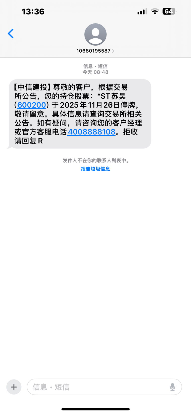 $*ST苏吴(SH600200)$ 周一1.18涨停杀入五成仓位!昨天无量封板,以为开始数板了,没想到突然收到退市停牌短信!瞬间感觉天塌了!