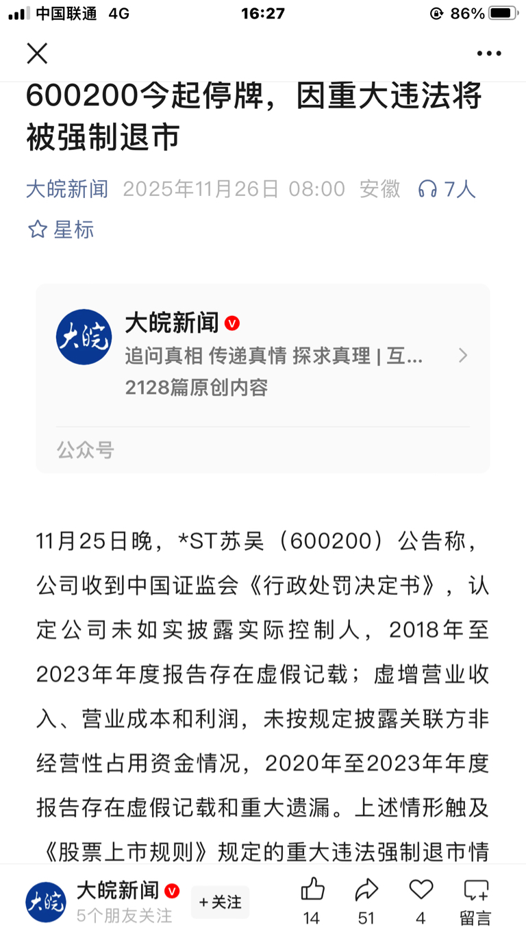 $*ST苏吴(SH600200)$ 财务造假,官宣: