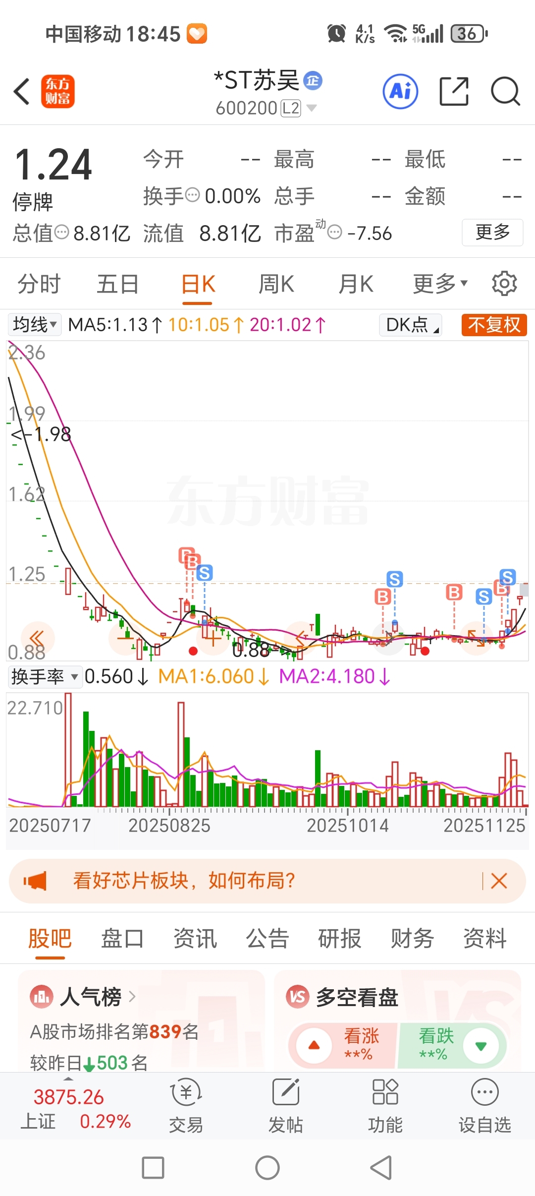 $*ST苏吴(SH600200)$ 不输不赢,刚好保本跑路,还以为卖飞了哦