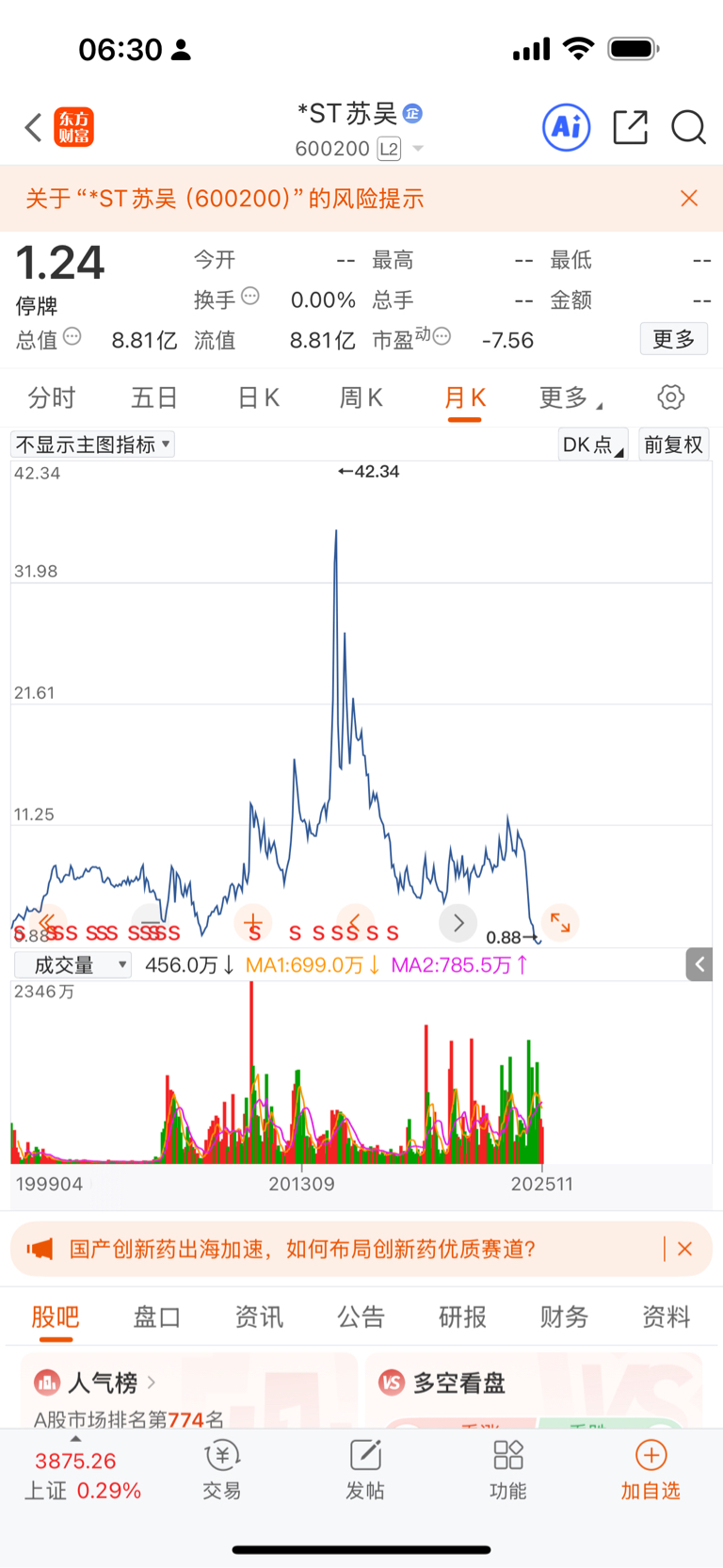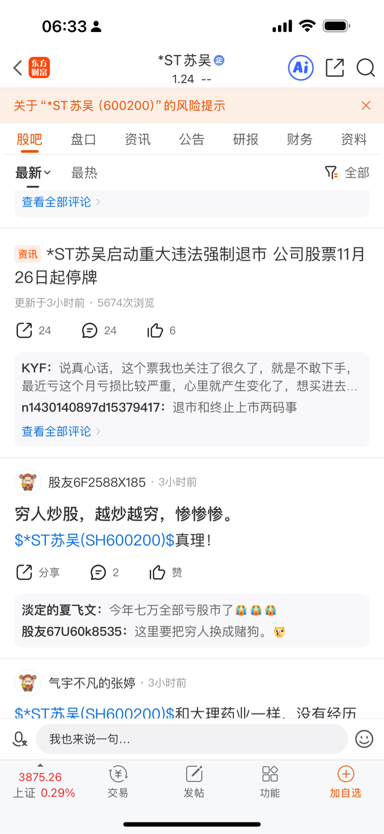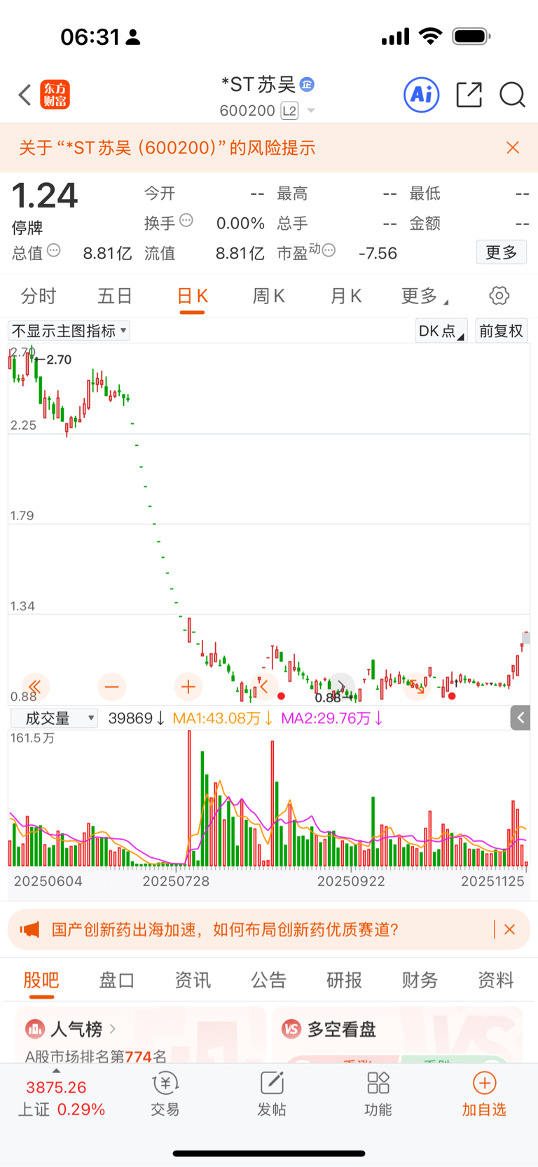 $*ST苏吴(SH600200)$ 多好的技术形态,低位横盘突破,连涨5天,属于笑着笑着突然就走了,里面的大户估计25号前几天内都自信满满,载歌载舞,在老婆面前那是一个嘚瑟和嚣张,25号之后,一夜回到解放前,打入地府,先是他自己懵了,后是他家人懵了,买的少算长个记性,要是买的多,那就惨了!