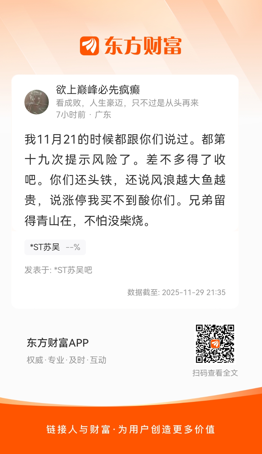 我11月21的时候都跟你们说过。都第十九次提示风险了。差不多得了收吧。你们还头铁,还说风浪越大鱼越贵,说涨停我买不到酸你们。兄弟留得青山在,不怕没柴烧。