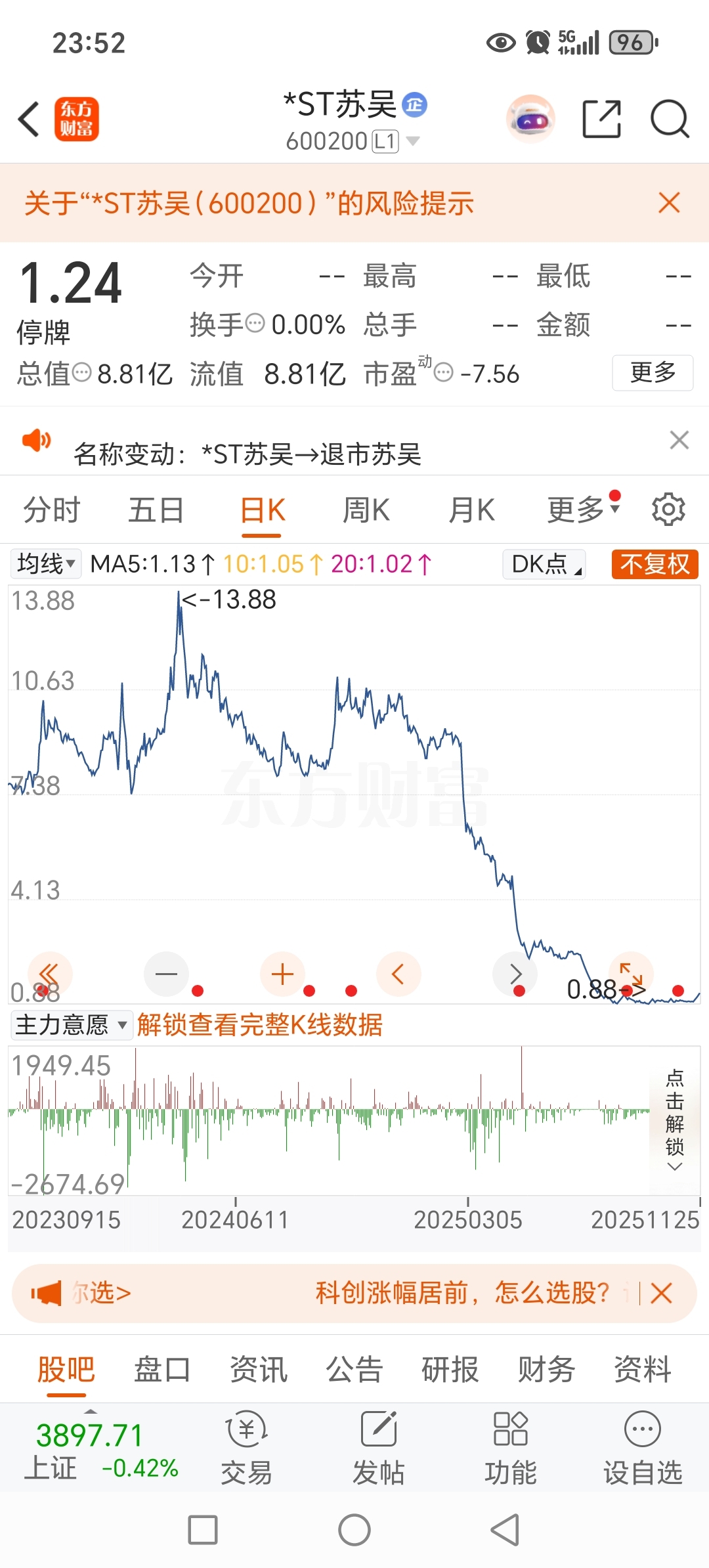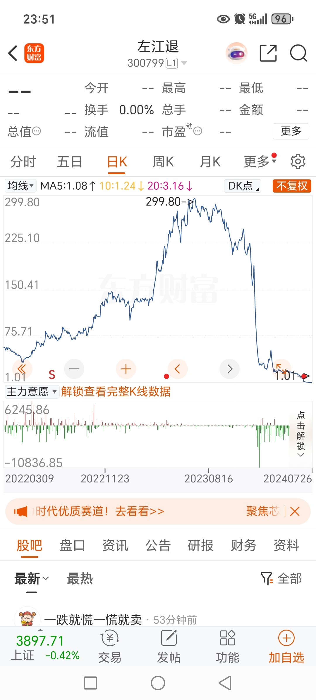 苏吴退,左江退,这走势太像了,一年的时间全在下跌,苏吴退到三板会不会爆涨8倍