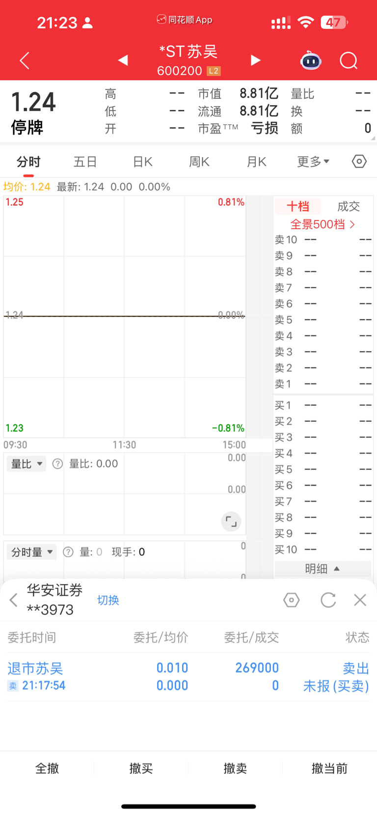$*ST苏吴(SH600200)$ 挂单了,下辈子再也不炒股了