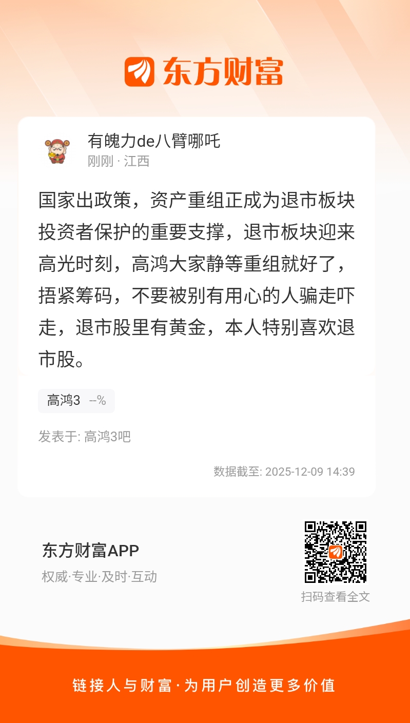 国家出政策,资产重组正成为退市板块投资者保护的重要支撑,退市板块迎来高光时刻,高鸿大家静等重组就好了,捂紧筹码,不要被别有用心的人骗走吓走,退市股里有黄金,本人特别喜欢退市股。