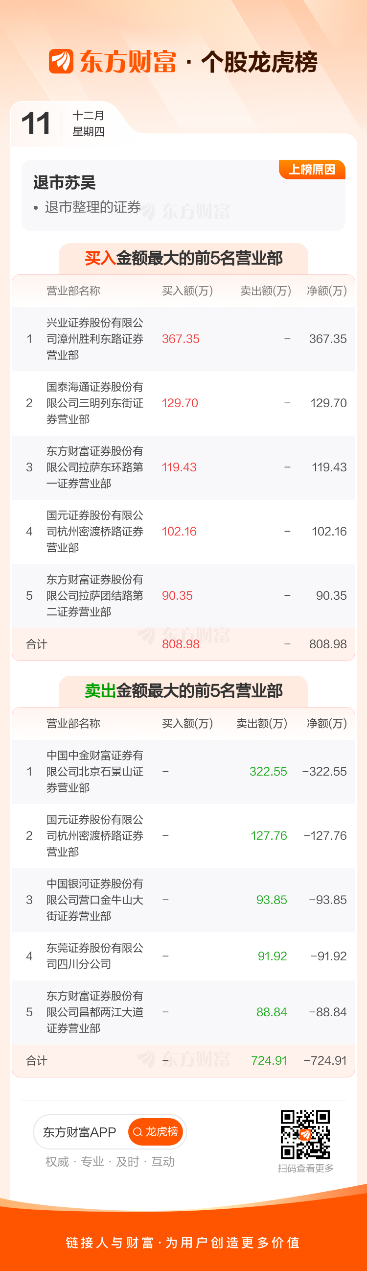 交易所2025年12月11日公布的交易公开信息显示,退市苏吴因成为退市整理的证券上榜。退市苏吴当日收报0.45元,涨跌幅2.27%,换手率10.22%,成交额3354.91万。