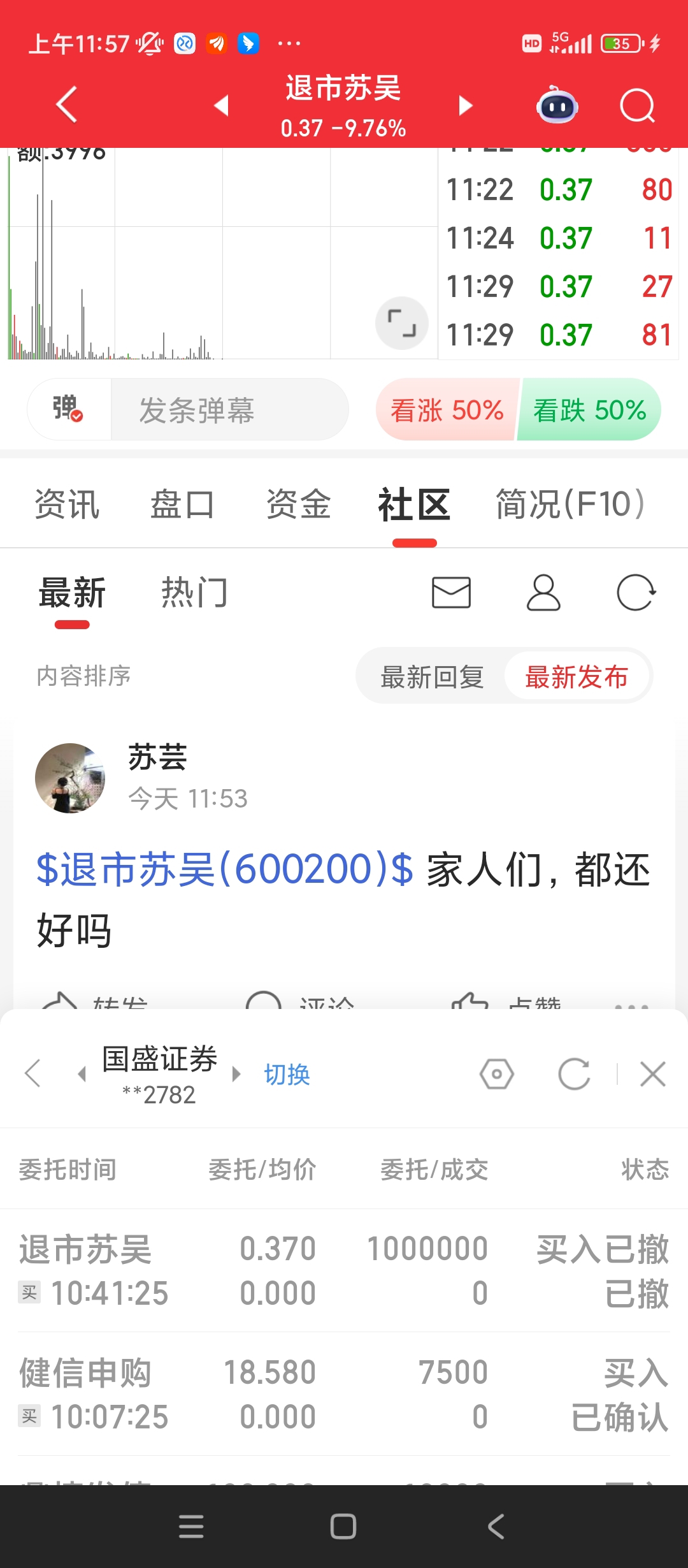 $退市苏吴(SH600200)$ 我就试了下撤了,中午电话就打过来了