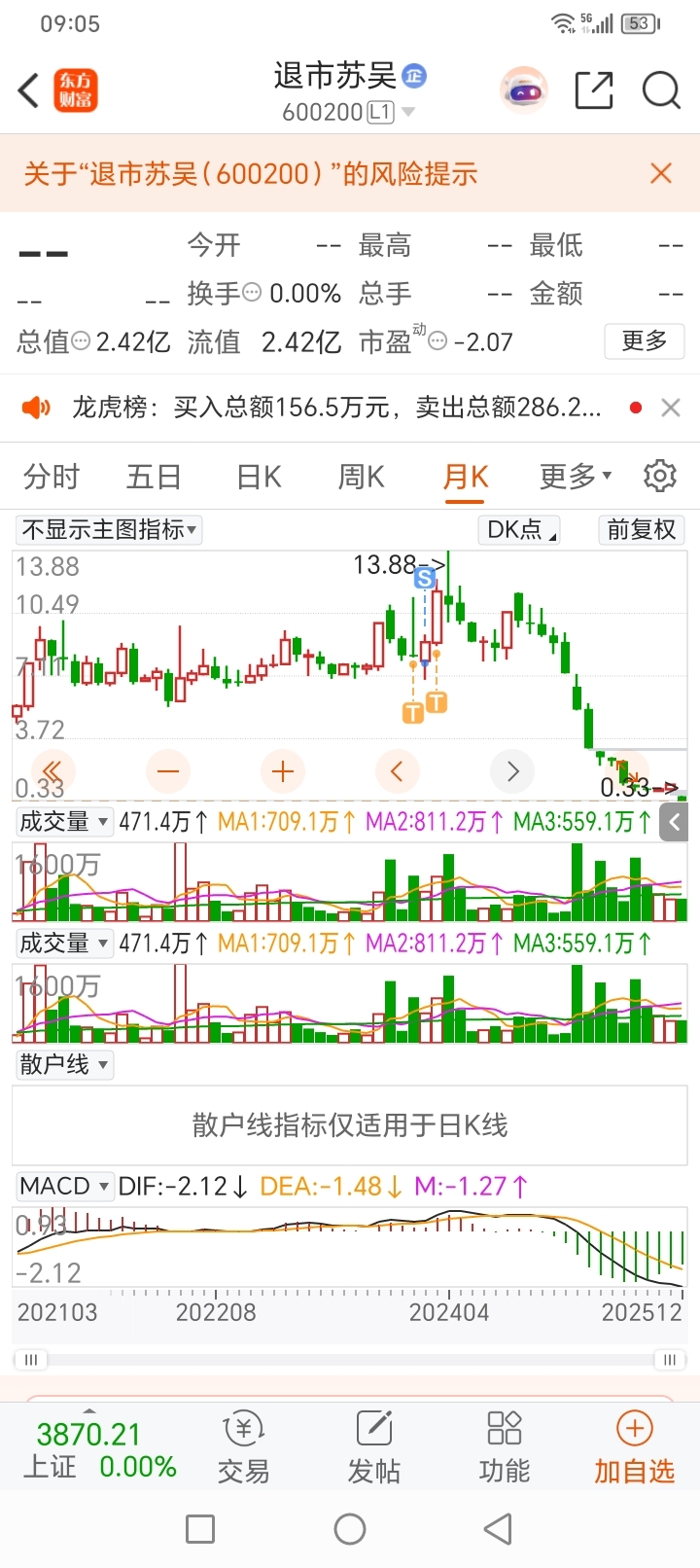 $退市苏吴(SH600200)$ 回头看,幸亏不是做长线价值投资!不然裤衩子都没有。