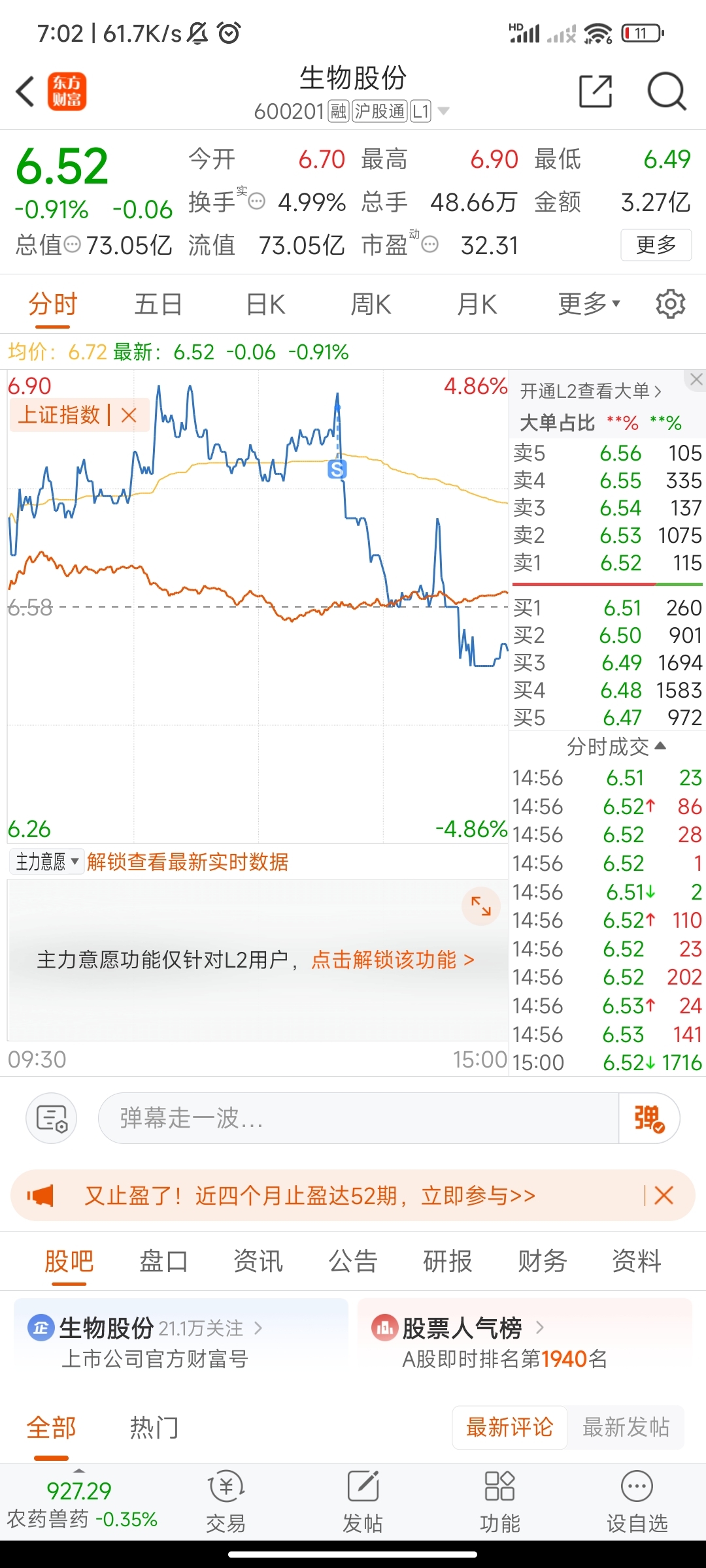 $生物股份(SH600201)$ 虽然这次小亏一点点,但是要挣钱还是没问题的,因为要买房子了,只能先出来了。好股票,大家发财。