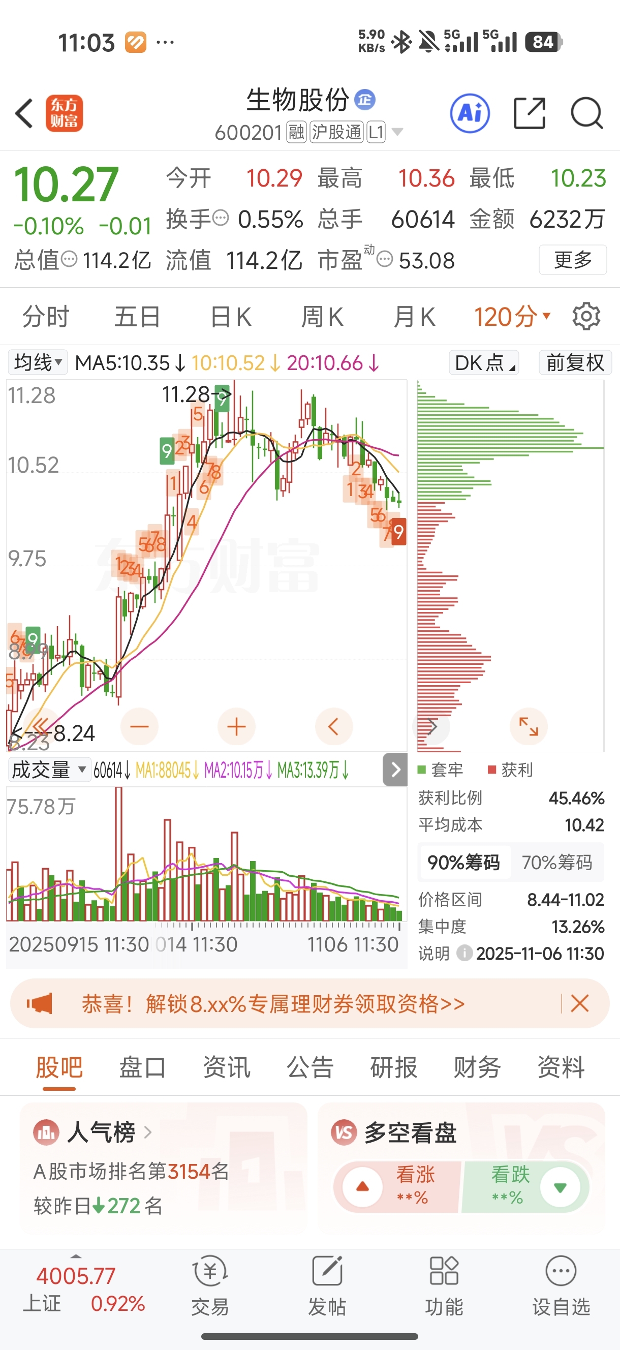 $生物股份(SH600201)$ 半日线低九出现,观察反弹力度