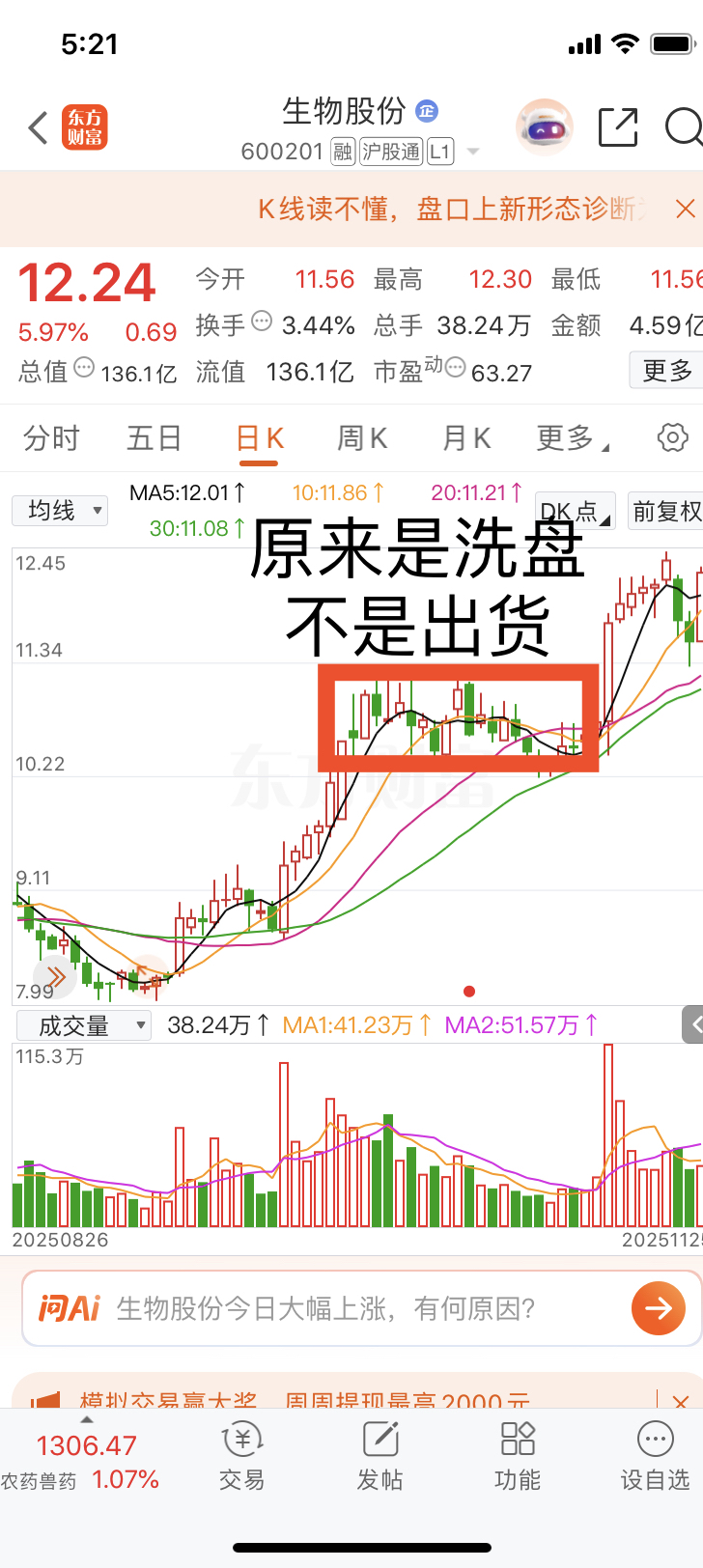 $生物股份(SH600201)$ 行情只有走出来才能发现,现在回头一看,原来前期高位震荡仍为洗盘,并非庄家出货。那么问题来了,现在能加仓吗?后市会迎来第二波大涨行情吗?这就是炒股最难的地方。现在买入,面临的都是获利盘,随时随地都可以砸你,全凭主力心情。不买,主力又会继续推高,让已下车的你心有不甘。