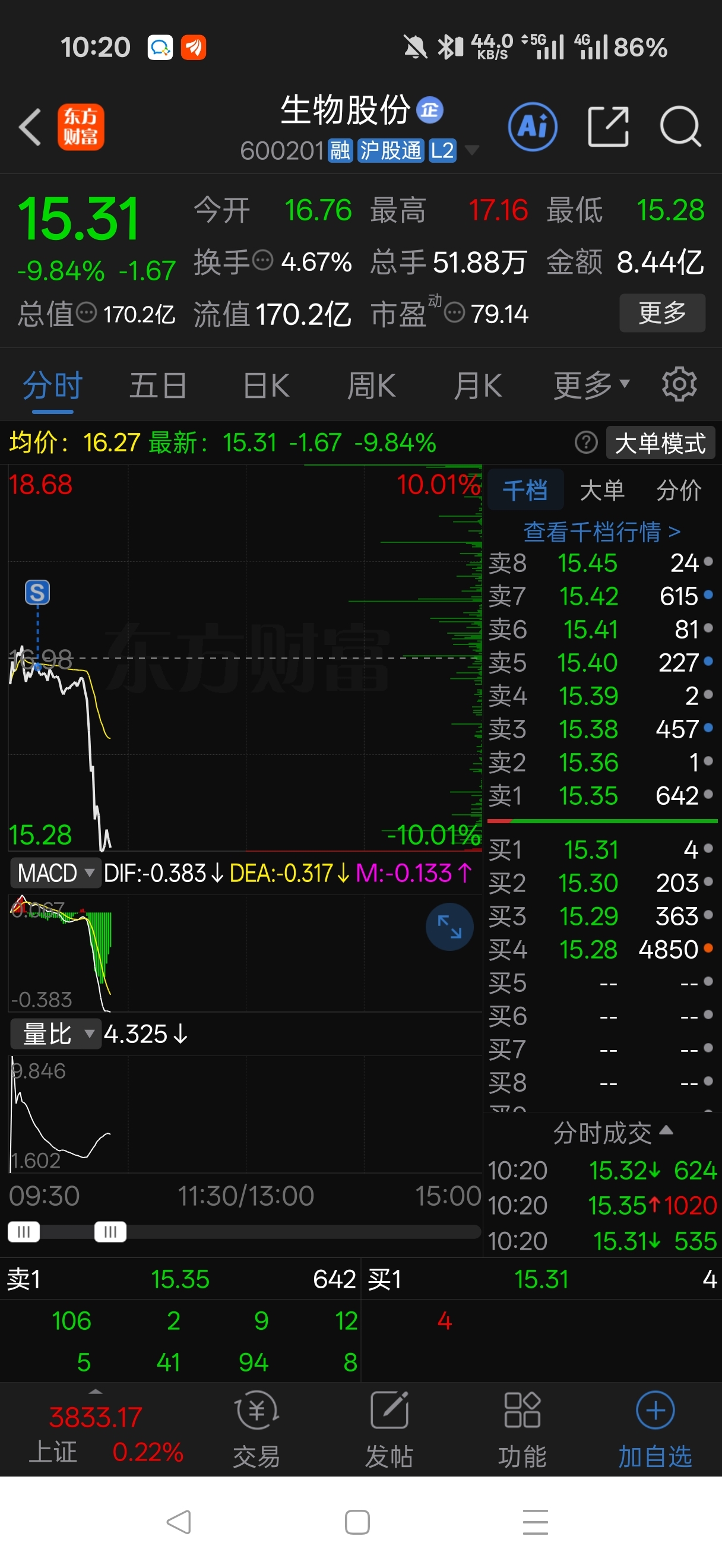 $生物股份(SH600201)$ 我这操作可以打几分,今天甚至还盈利了1分钱